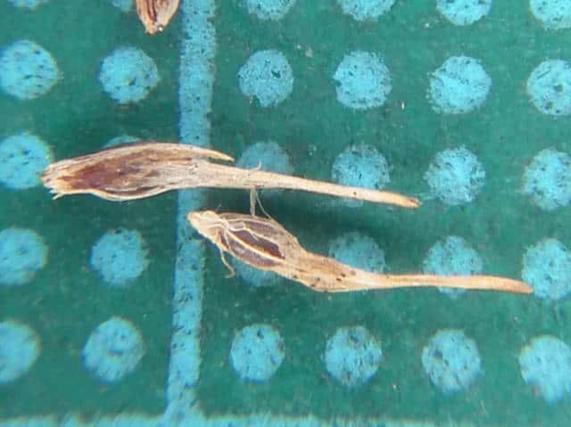 | ▼果実に長い花柱が残る。 | ▼果実は3稜があり、長さ約1.5mm。 | |