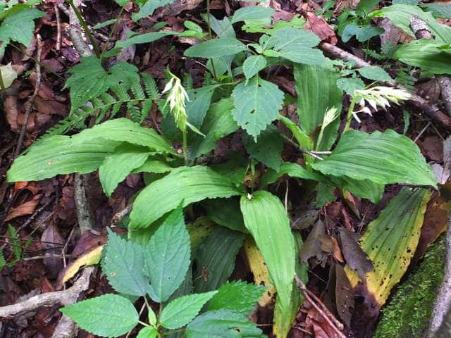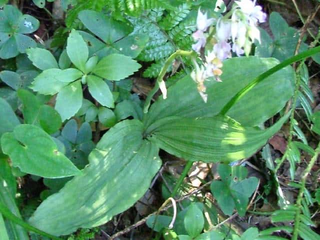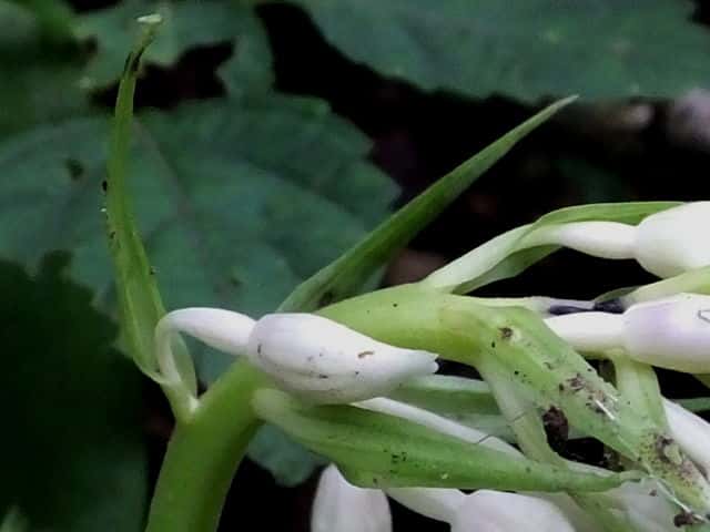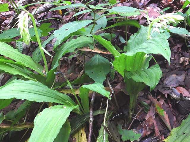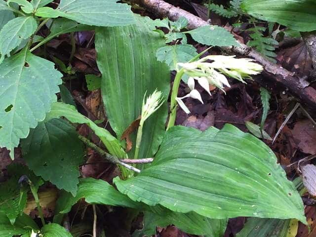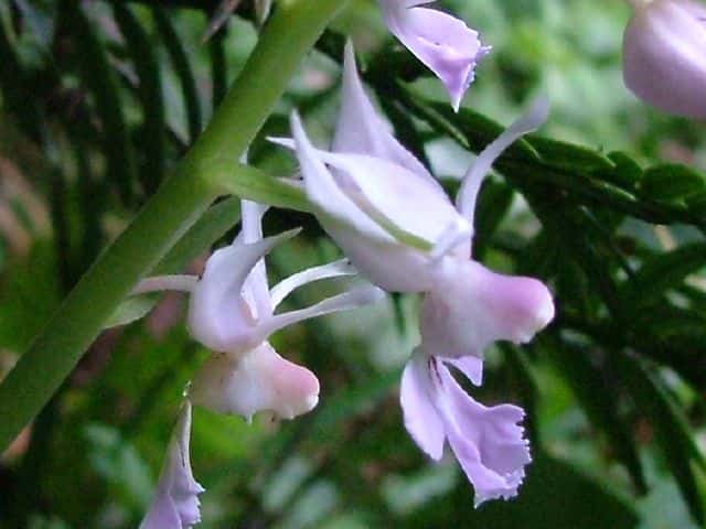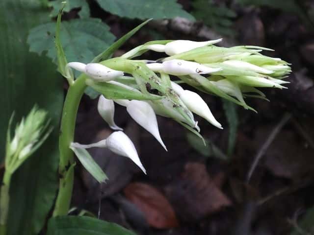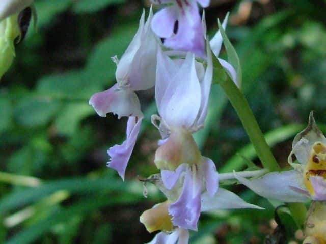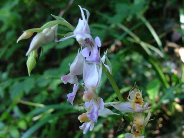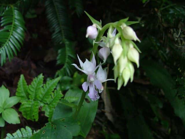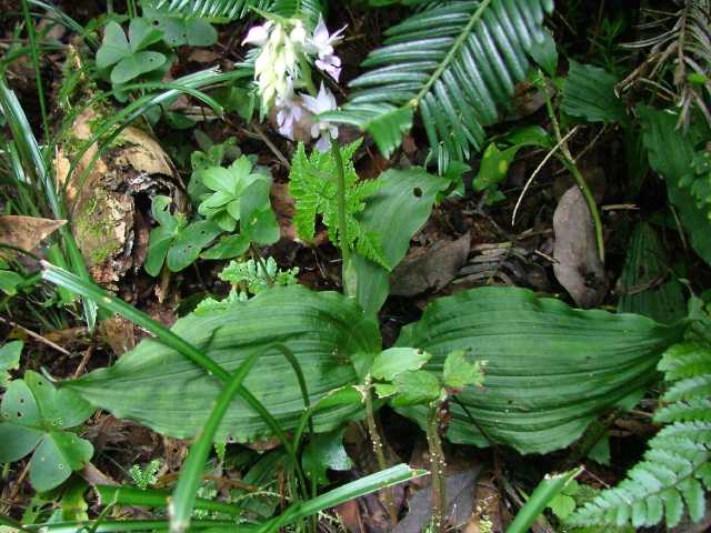 | 多年草 本州〜九州の沢沿いの林床に生える。葉は3〜5枚で長楕円形、長さ10〜30cm、幅3〜6cmで先は尖る。表面は少し白みを帯びた緑色で、縦皺が多い。花茎の高さ20〜40cm。花は淡紫色で10〜20個つける。花穂は蕾の時、重そうに下を向いている。萼片は長さ1.3〜1.8cm、卵形で先が尖り、花時には3枚がそり返る。側花弁は細く弓状に曲がる。唇弁は心状広卵形、長さ約1.5cmで3裂し、側裂片は腎形、中裂片は大きく、縁は細かい波状になって尖る。花期は7〜8月。(広島の山野草) 学名は、Calanthe puberula ラン科エビネ属 |