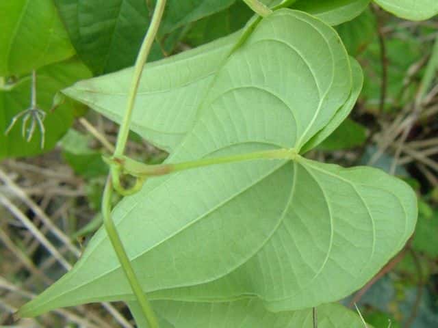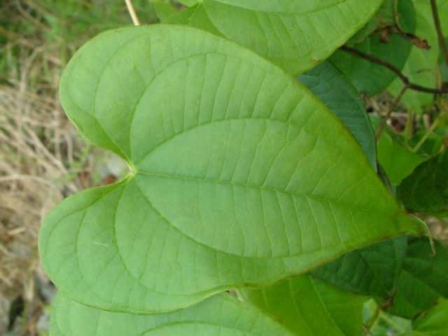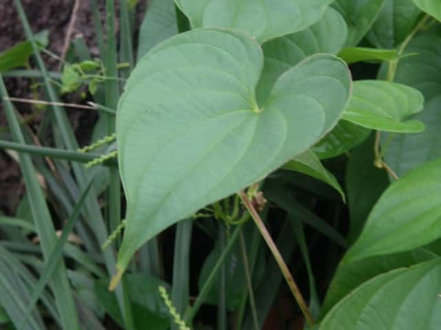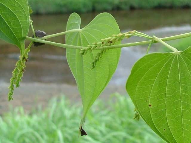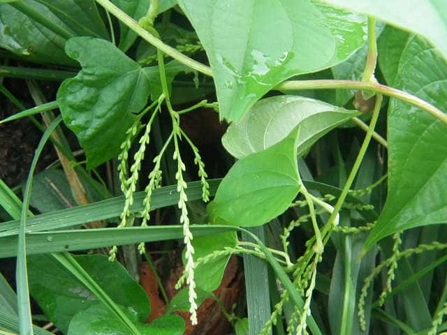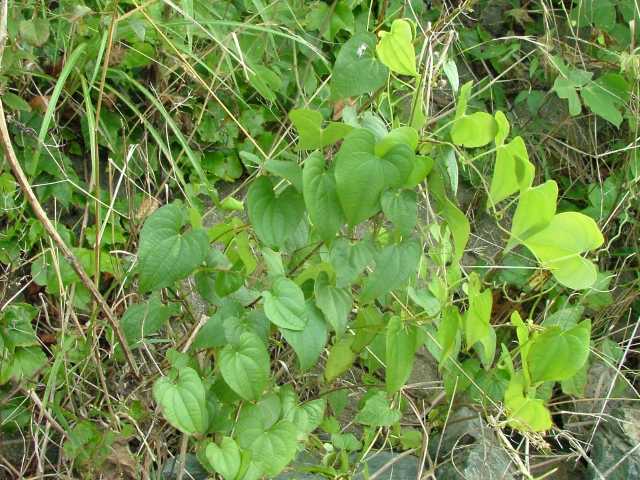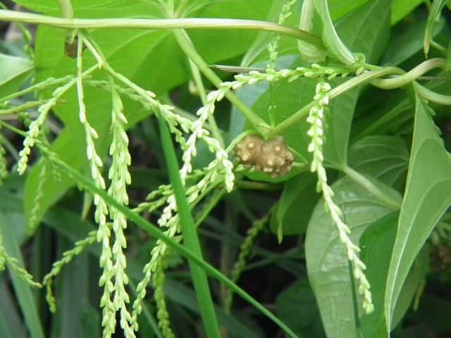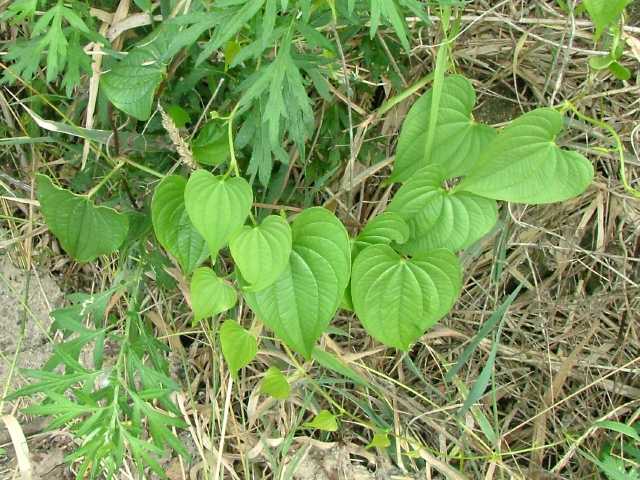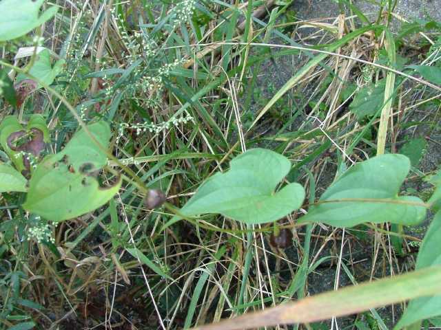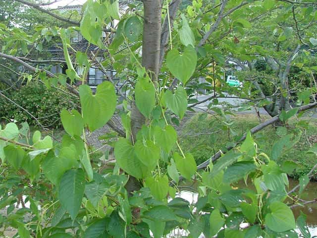 | つる性多年草 関東地方以西〜沖縄の山麓や川岸などに生える。塊根は大きく円形で、外皮は黒く、ひげ根が多い。茎は長く、葉は互生し、長柄がある。葉身は、大きな円心形で鋭尖頭、全縁、7〜11脈があり、無毛、幅5〜12.5cm。柄は3〜9.5cm。葉腋に珠芽ができる。雄株は葉腋から穂状花序をだすかまたは穂状花序を複生した円錐花序をだす。雄花は無柄、苞と少苞がある。花被片は6個、紫色を帯びる、披針形、鈍頭、長さ2mm。雄しべ6個。雌株は葉腋から長い穂状花序をだす。花被片は6、披針形、鈍頭、長さ2mm。雄しべは6、花柱は長さ0.7mm、先は3裂。花期は8〜10月。(原色日本植物図鑑) 学名は、Dioscorea bulbifera ヤマノイモ科ヤマノイモ属 似た花の比較 |