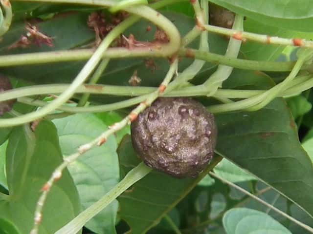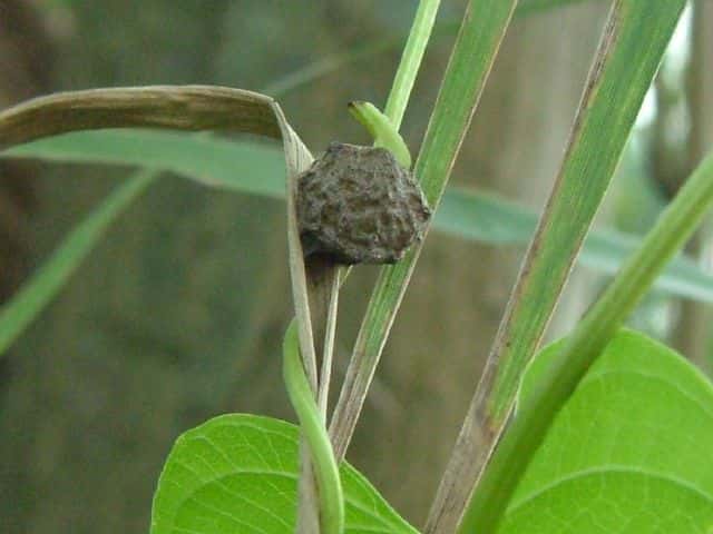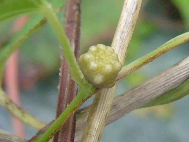 | ▼2012年9月11日 蕾とムカゴ 玉湯 | ▼ムカゴには突起があり、直径約1.2mm。 | |