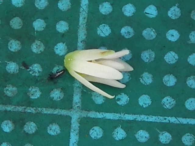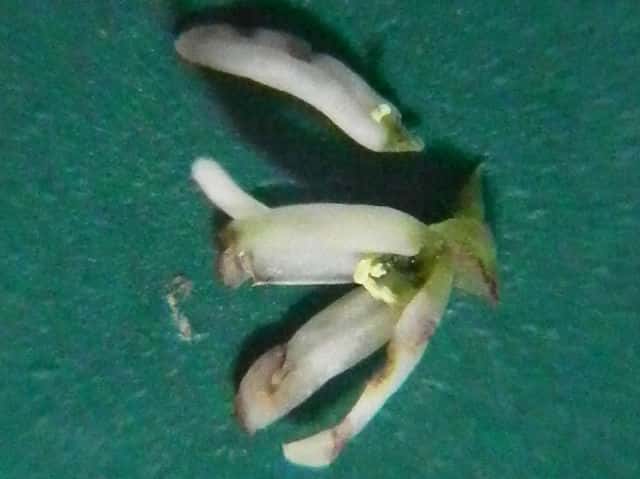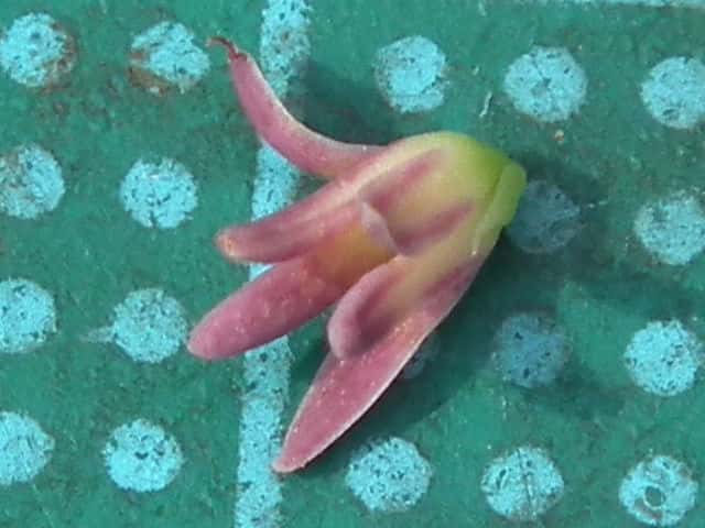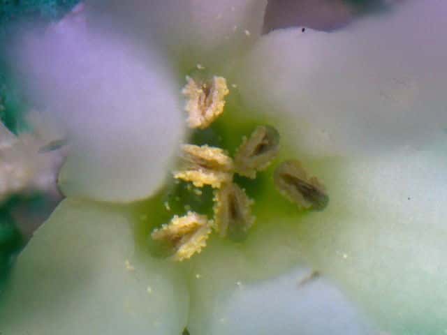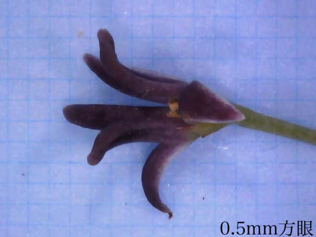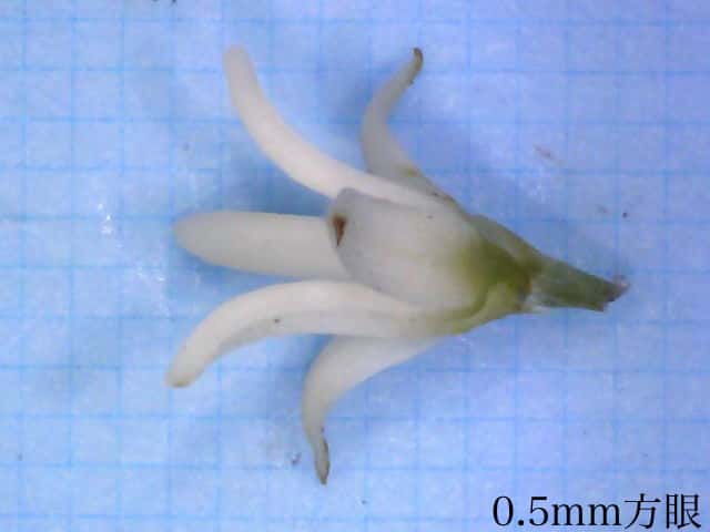 | ▼花は長さ約4mm。花被片は6個。 | ▼花冠の内部、雄しべは6個。 | |