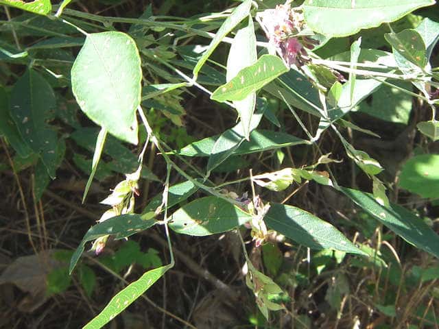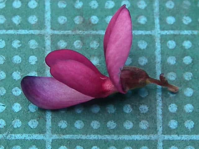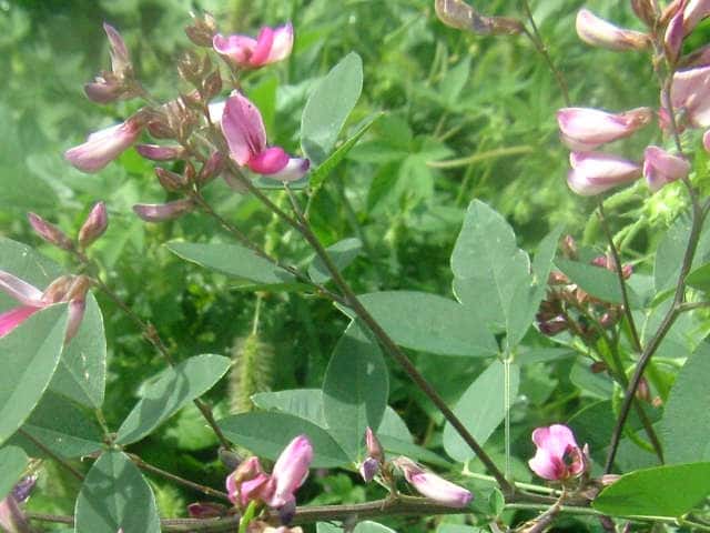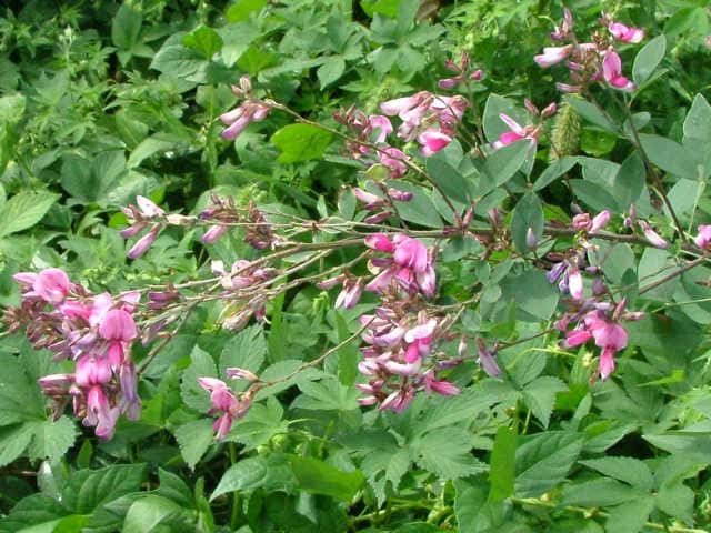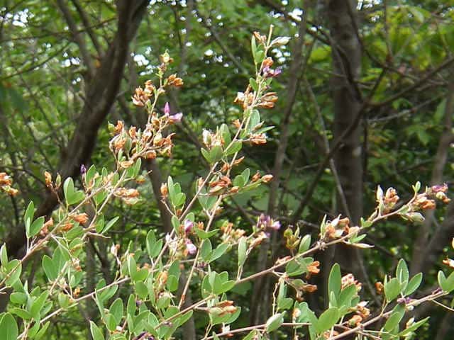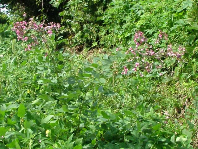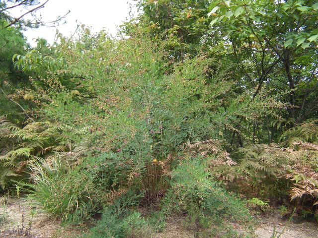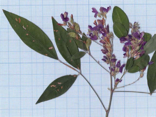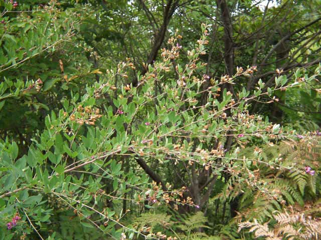 落葉半低木 ニシキハギはビッチュウヤマハギと同種とされることもあるが、ニシキハギは野生種であるビッチュウヤマハギが栽培されている間に他の種と交雑をして生じたいろいろな型の雑種の集合と考えられる。(ハギ属の分類(東京大学総合研究博物館))花期は8〜10月。 学名は、Lespedeza thunbergii subsp. thunbergii 'Nipponica' ビッチュウヤマハギ 本州中部以西〜九州に生える。高さ2〜3m。小葉は長さ2〜6cmの長楕円形で、両面に細毛がある。葉腋から長い花序を出し、花は濃紅紫色で長さ1〜1.3cm。旗弁の裏は淡紅白色で、先はわずかに尖る。翼弁より竜骨弁がやや長い。萼は4裂し、筒部よりも裂片が長く、先端は鋭く尖り細毛がある。別名 ニシキハギ。花期は8〜10月。 学名は、Lespedeza thunbergii subsp. thunbergii f. angustifolia マメ科ハギ属 |