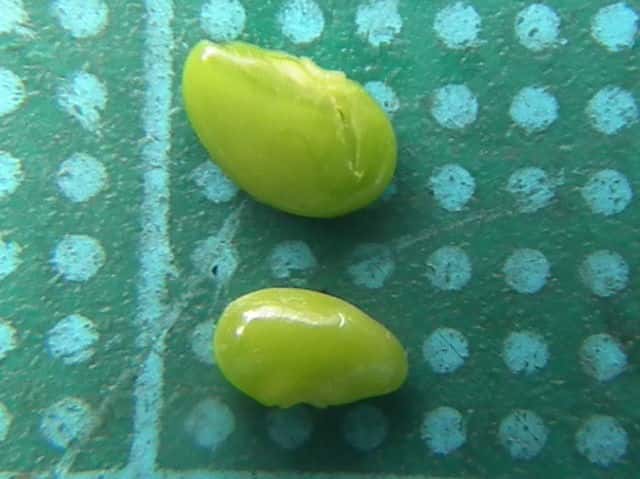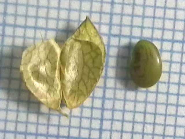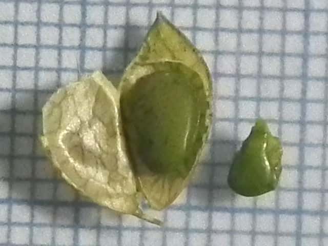 | ▼萼は4裂する。 | ▼種子は1個。右は他の果実の小さな種子。 | |