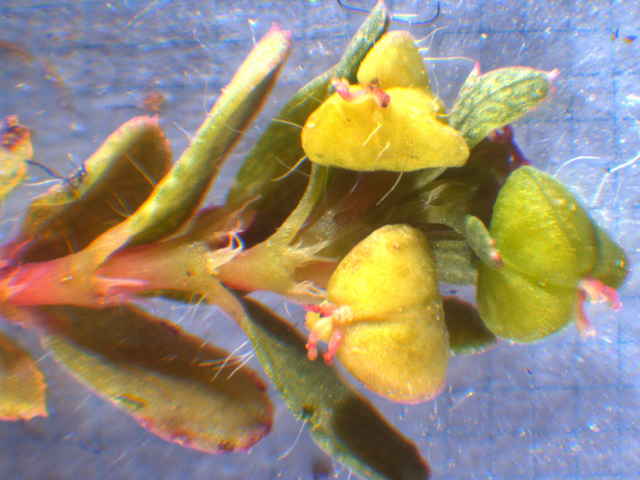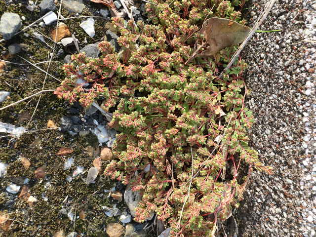 | 1年草 本州〜沖縄の畑、庭、空き地などに多い。茎は長さ10〜25cmで細くて赤みを帯び、よく分枝して地をはう。葉は茎の両側に対生し、長さ0.4〜1cmの長楕円形。基部は左右が非常に不ぞろい。表面には斑紋はあるが、不明瞭でコニシキソウほど目立たない。枝上部の葉腋に淡赤紫色の杯状花序がまばらにつく。つり鐘形の総苞の上部には長楕円形の腺体が4〜5個あり、それぞれにエプロン状の付属体がつく。さく果は直径約1.8mmの卵球形で3稜があり、表面は無毛。種子は長さ約0.7mm。花期は7〜10月。(野に咲く花) 学名は、Euphorbia humifusa トウダイグサ科トウダイグサ属 よく似たコニシキソウはさく果に毛がある。 |