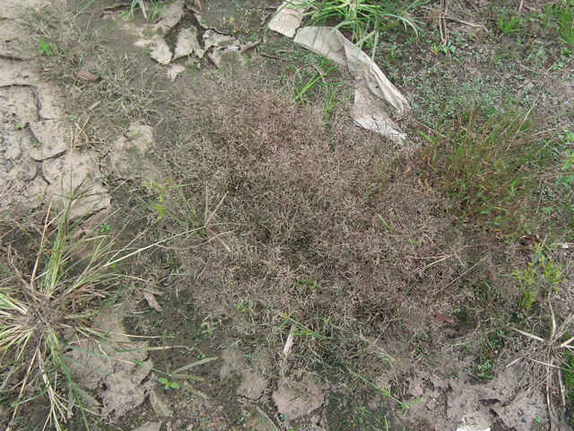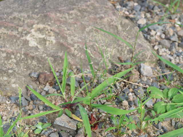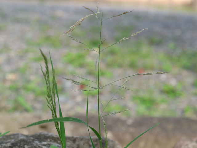 | 1年草 北海道〜沖縄の路傍や庭園、畑地、果樹園などに生育し、やや群生する。茎は下部は屈曲するが上部は直立し、分けつして叢生する。高さ15〜30cm。葉は長さ5〜12cm、幅2〜3mm、線状披針形。葉舌は短く毛状、葉鞘の口部に毛がない。花序は楕円形、直立し、長さ7〜12cm、花序の枝は少し屈曲し、小穂は卵形または長楕円形、長さ3.5〜4mm、淡紫色、5〜7小花からなる。苞穎は幅が狭く、第1苞穎は短い。小花は卵形、長さ1.5〜1.8mm。果実は狭卵形、赤褐色、鈍頭、腹面は突形、臍は点状、赤褐色、無光沢、長さ0.6〜0.8mm。花期は8〜9月。(日本イネ科植物図譜) 学名は、Eragrostis multicaulis イネ科カゼクサ属 |