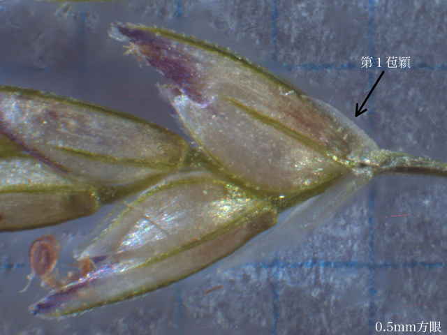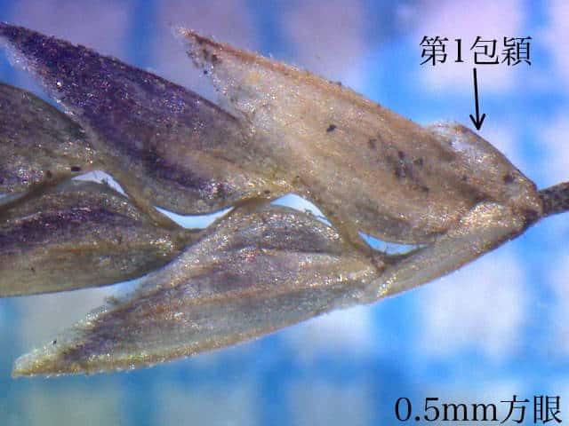 | ▼小穂の柄に環状の腺はない。 | ▼小穂は長さ約4mm。 | ▼第1苞穎は極端に短い。 |