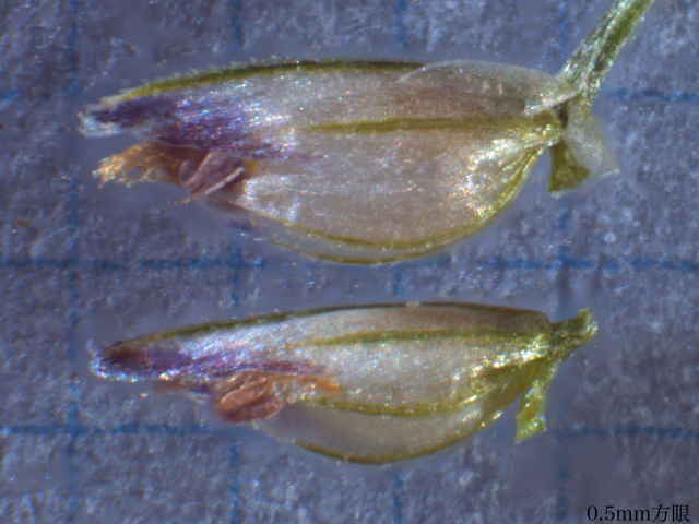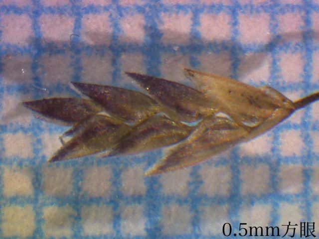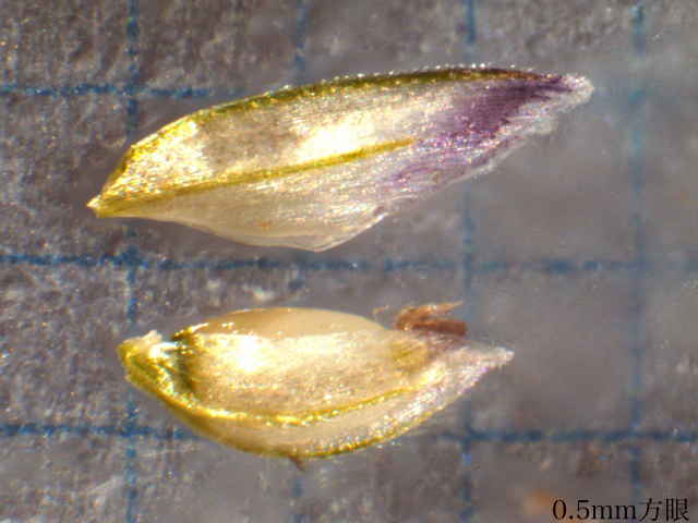 | ▼第1苞穎は短い、小花は長さ約1.5mm。 | ▼果実は長さ0.5〜0.6mm。 | |