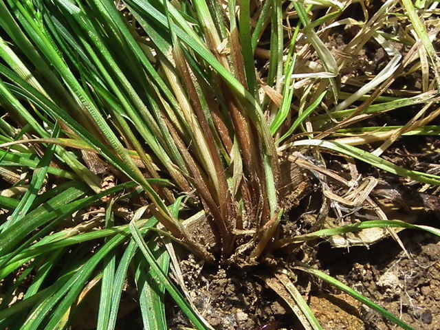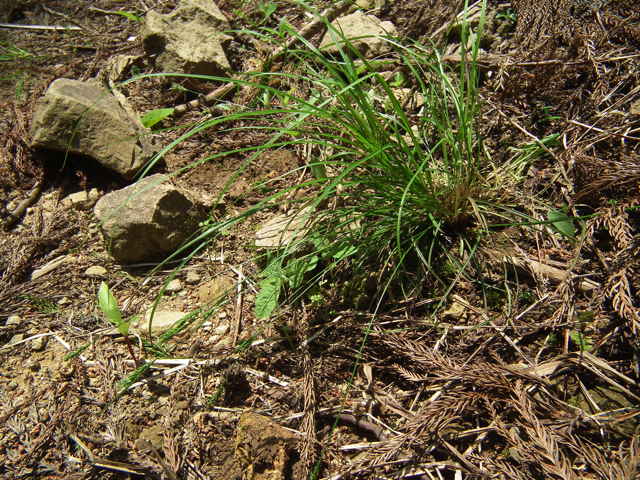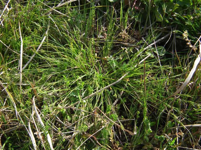 | 多年草 本州〜九州の林縁や路傍に生える。やや大きな株となり、匍匐枝はない。稈は高さ10〜25cm、平滑。葉は稈より長く、幅1〜1.5mm、平滑、ややざらつく。基部の鞘は長さ2〜5cm、黄褐色〜栗色。小穂は2〜5cmの範囲に集まってつく。苞の葉身は葉状、長さ1〜4cm。頂小穂は雄性で短く0.5〜1cm、線形、通常雌小穂に隠れる。雄鱗片は長さ2.5〜3.5mm、蒼白色、光沢があり、鋭頭。側小穂は雌性で柱状、長さ1〜1.5cm、柄はない。雌花は3〜7列、雌鱗片は倒卵形、長さ2.5〜4mm、蒼白色、光沢があり、芒は長く0.7〜1.5mmで突出する。果胞は長卵形、長さ2.5〜2.8mm、幅0.6〜0.8mm、稜間に6〜8脈あり、平滑または短毛を持つことがある、嘴は短く0.4〜0.6mm。そう果は密に果胞に包まれ卵状楕円形、長さ1.5〜1.8mm、幅0.7〜0.9mm、鈍3稜形、褐色〜橙褐色で光沢があり、頂部に盤状付属体があり花柱基部に接続する。柱頭は3。花期は4〜5月。(岡山県スゲ属植物図譜) ヌカスゲとメアオスゲの中間的なイメージのもの。メアオスゲとは果胞が小さく痩せていて、ほとんど毛がないこと、基部の鞘の褐色部分の長さも長いことで区別する。ヌカスゲとは雌鱗片に芒があることと、苞の葉身が長い点が異なる。雄小穂はきわめて短い。まれに根際に雌小穂をつけることがある。柱頭は3岐。果期は4〜5月。(日本のスゲ) 学名は、Carex mitrata var. aristata カヤツリグサ科スゲ属ヌカスゲ節 アオスゲ類と間違われるが、雄小穂は線形で細くアオスゲのような棍棒状ではない。 |
