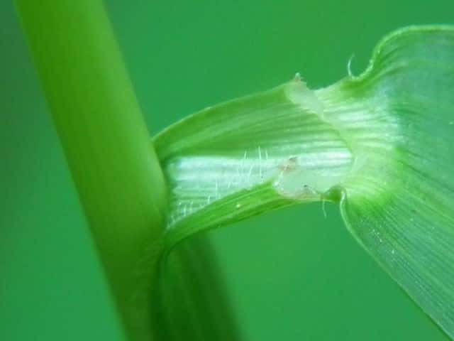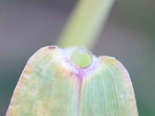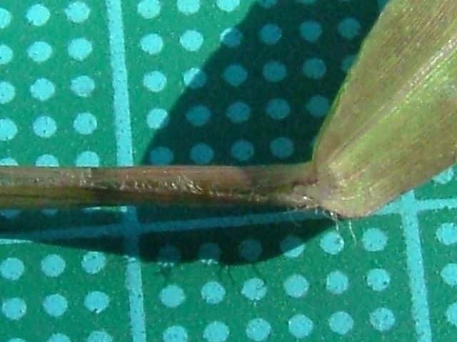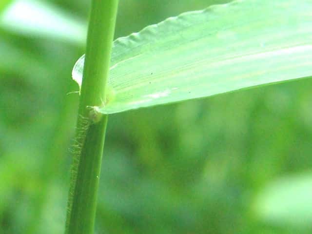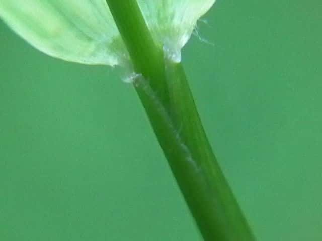 | ▼小穂は長さ約2mm、第1苞穎は約1mm。 | ▼葉鞘の片側に毛がある。 | |