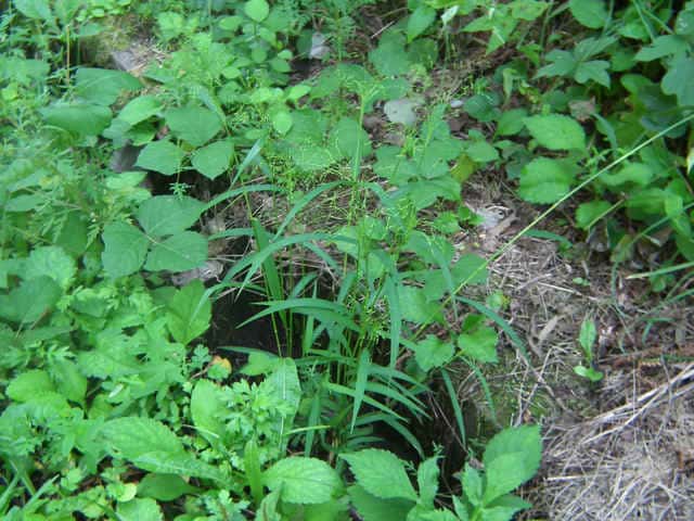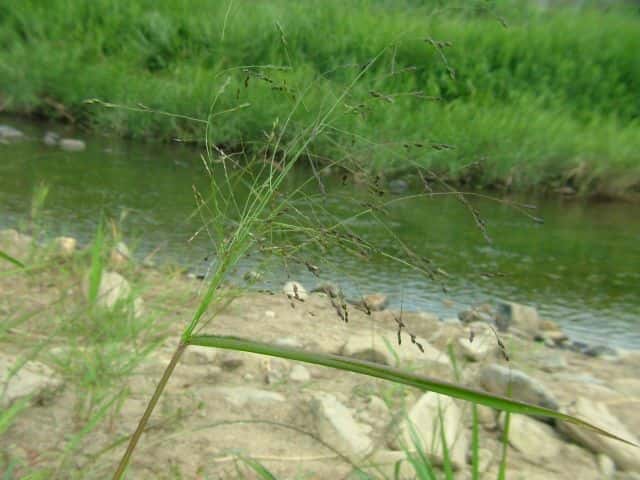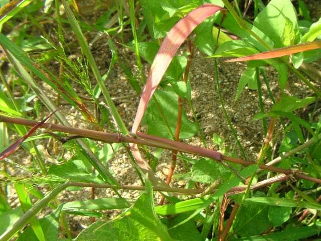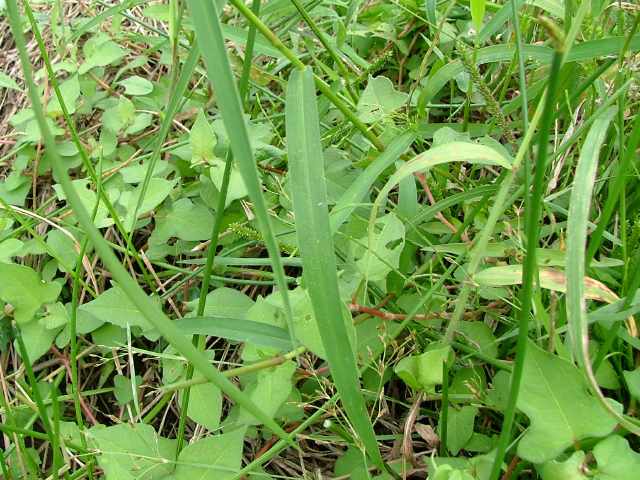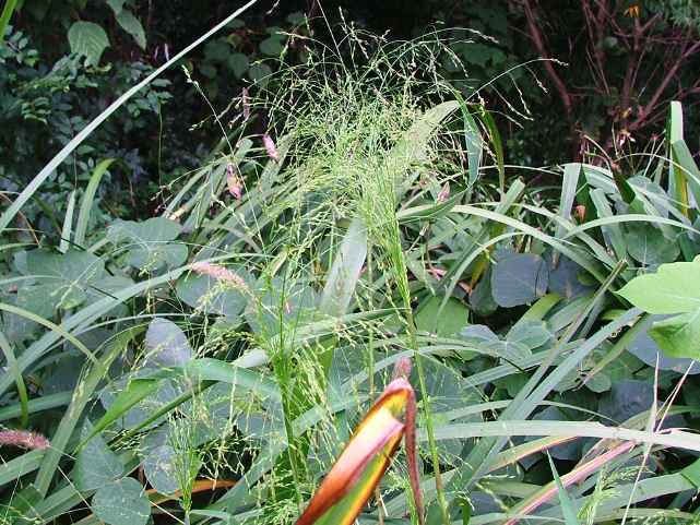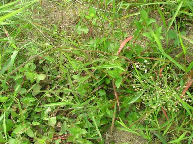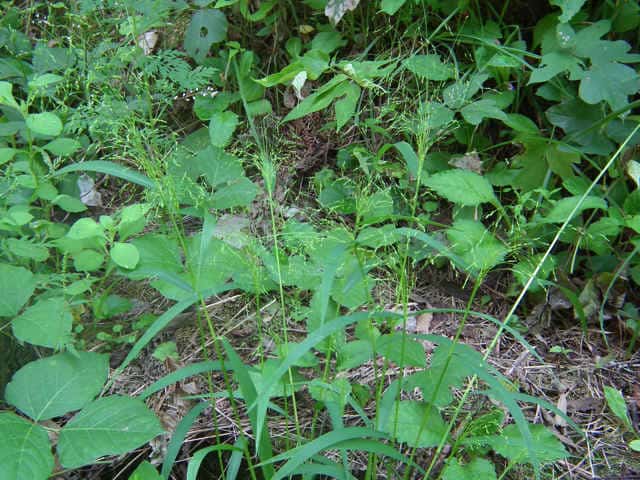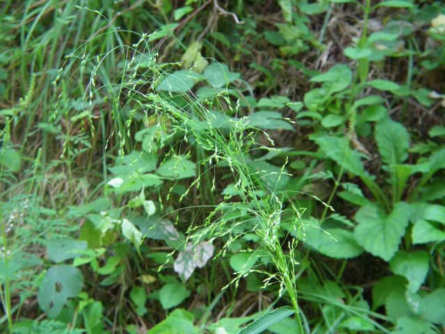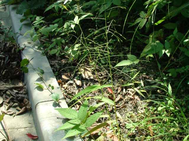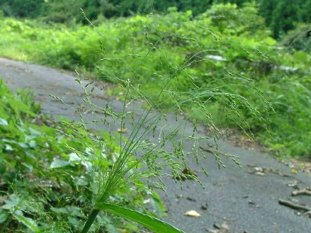 | 1年草 北海道〜沖縄の畑地や田のあぜ、路傍、空き地などに生育し、やや群生する。茎は高さ30〜120cm、細長く、直立し、基部は分けつして叢生する。葉は長さ5〜20cm、幅4〜13mm、無毛。花序は卵円形、長さ15〜30cm、花序の枝はほとんど水平に開出し、緑紫色の小穂をまばらにつける。小穂は倒卵形、長さ2〜2.5mm、2小花からなるが第1小花は退化して護穎のみとなる。第1苞穎は長さ1mm、第2苞穎は第1小花の護穎と同長。第2小花の護穎と内穎は厚くガラス光沢がある。果実は広楕円形、突頭、暗褐色、長さ1.5mm。花期は8〜9月。(日本イネ科植物図譜) 学名は、Panicum bisulcatum イネ科キビ属 |