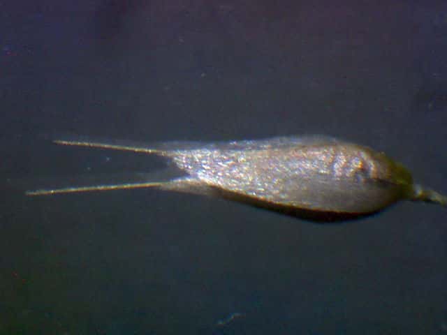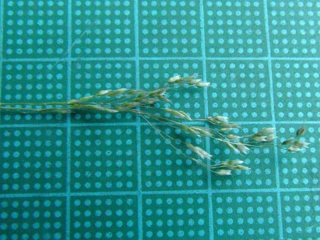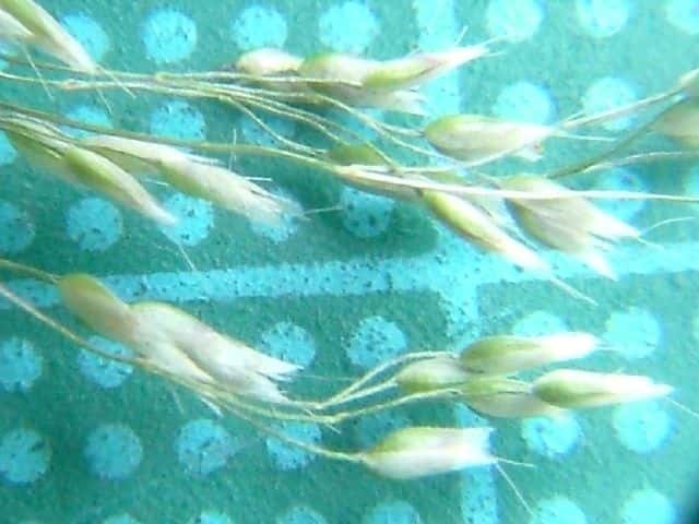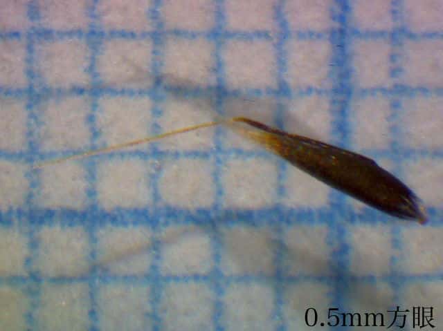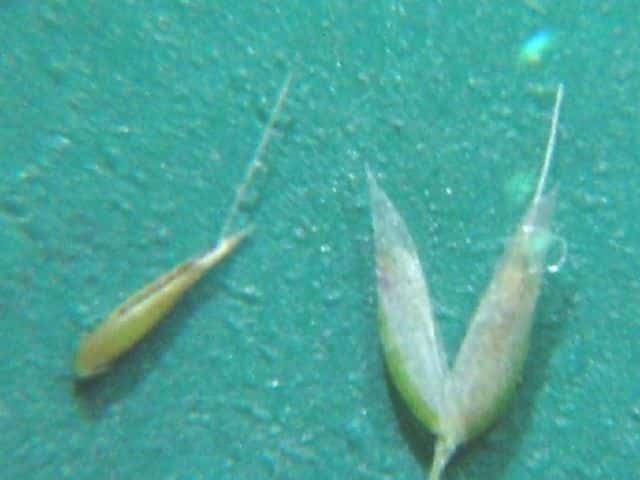 | ▼小穂は長さ約2.5mm、2個の芒が出る。 | ▼2個の苞穎、芒はほぼ同長。 | ▼小穂には2小花があり、各々に芒がある。 |
