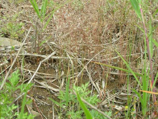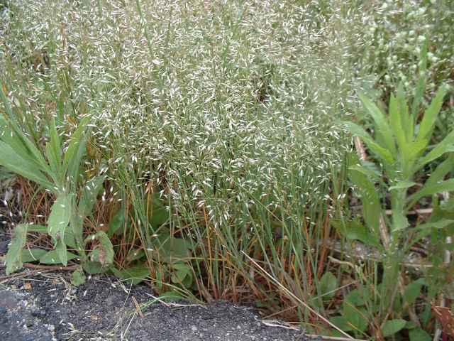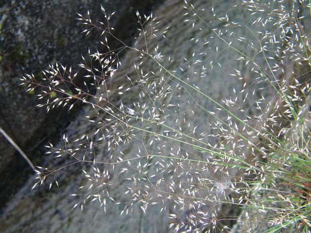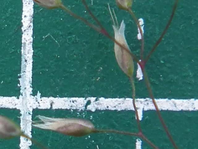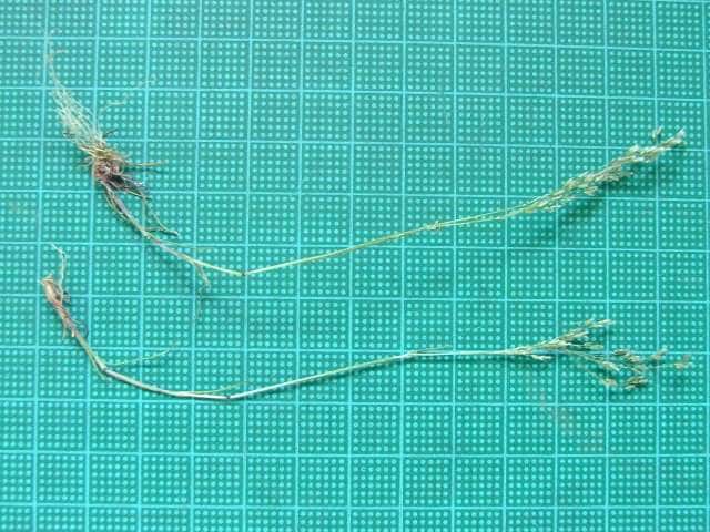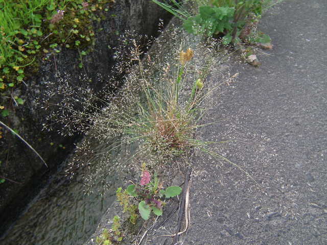 | 1年草 ヨーロッパ原産。明治年間の初めに観賞用に導入された。東海地方以西の陽当たりのよい道ばたや空き地に群生する。稈は直立して高さ40cmほどになる。葉は線形でざらつくが無毛。稈の先端で細かく分岐して、長さ3mmほどで2小花を含む小穂をややまばらにつける。2小花には4mmほどの芒がある。 花期は春〜夏。(日本帰化植物写真図鑑) 学名は、Aira caryophyllea イネ科ヌカススキ属 よく似たハナヌカススキは小穂の芒が1本。 |
