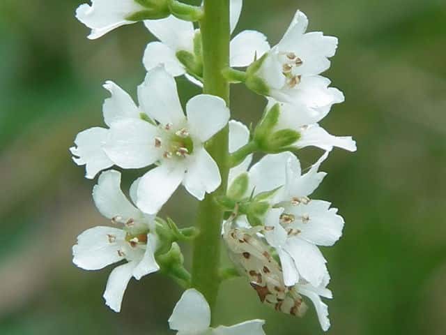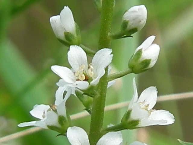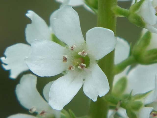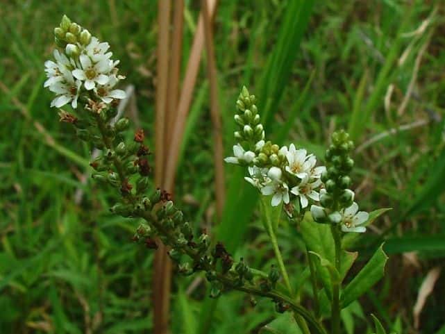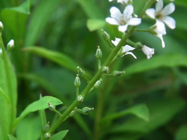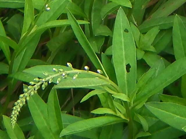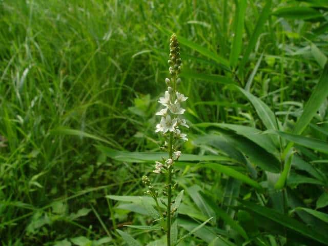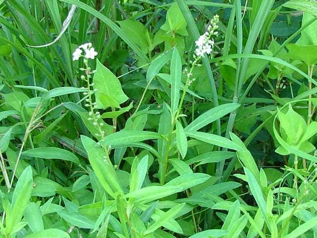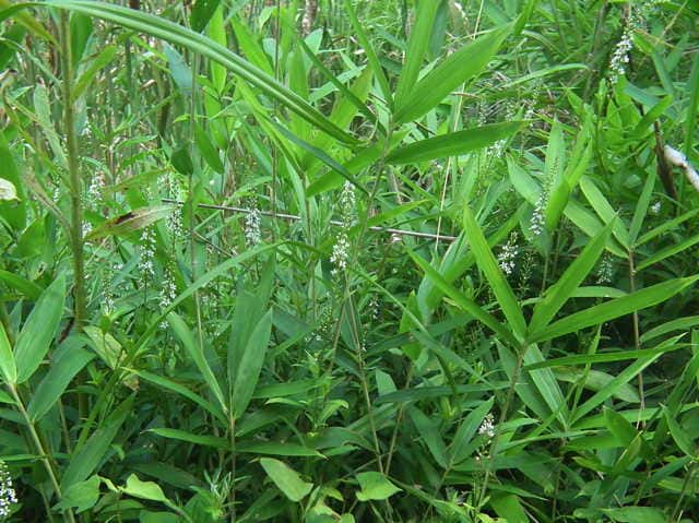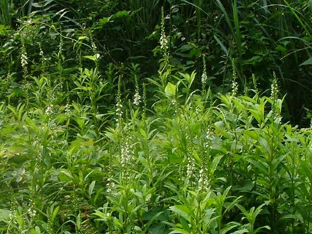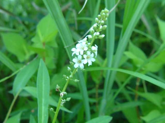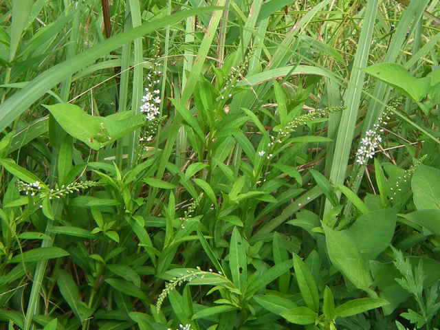 多年草 本州〜九州の湿地に萎える。高さ40〜70cm。地下茎を長くのばしてふえ、茎の基部は赤みを帯びる。葉は互生し、長さ4〜7cm、幅1〜1.5cmの倒披針状長楕円形で、先端は急に細くなってとがる。茎の先に総状花序を直立し、白い小さな花を多数つける。花期は7〜8月。(野に咲く花) 学名は、Lysimachia fortunei サクラソウ科オカトラノオ属 似た花のオカトラノオは、葉の幅が広く、花穂の上部が垂れる。 オカトラノオとヌマトラノオの交配種にイヌヌマトラノオがある。 |