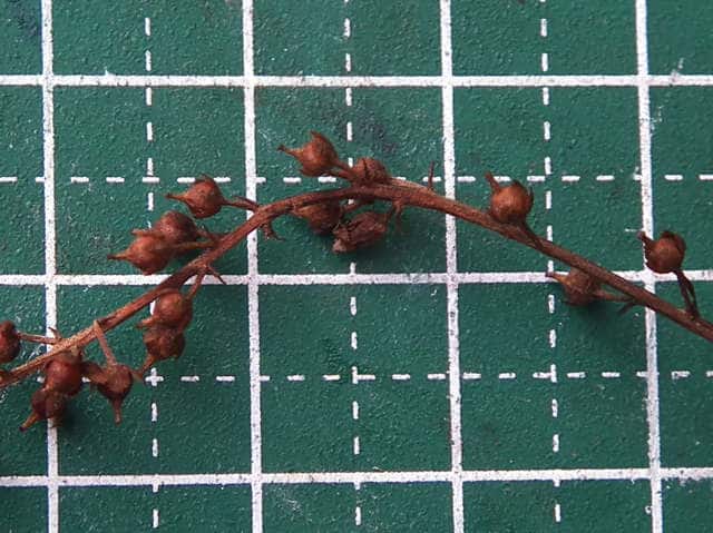 | ▼果実は直径約2mm、花柱が残る。 | ▼果実の中の球形の胎座に種子がある。 | |
