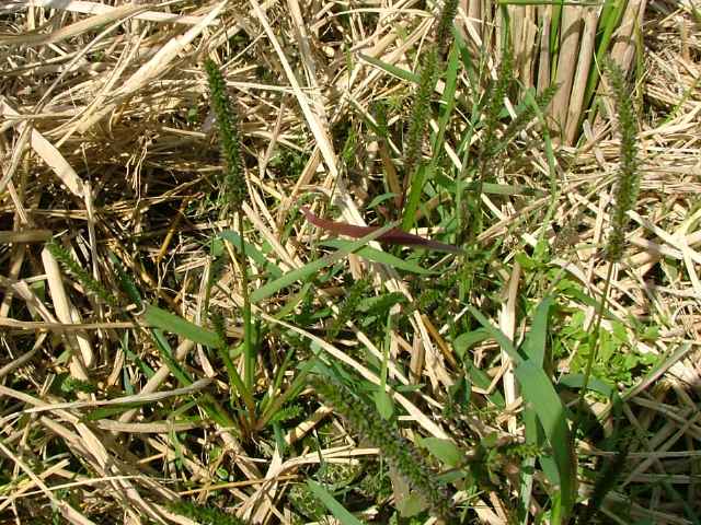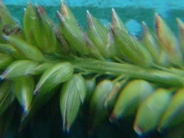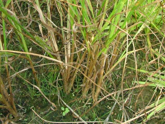 | 1年草 本州〜沖縄の湿潤な所に生育する。茎は高さ30〜60cm、直立・叢生。葉は長さ15〜30cm、幅3.5〜5mm、無毛、縁はざらつく。葉舌は厚く長さ0.5mm。葉鞘は無毛。花序は穂状、長さ6〜12cm、径5〜6mm。小穂は楕円形、淡紫色、上部にはまばらな毛があり、長さ2.8〜3mm、短い小梗をつけて花軸に密集し、2小花からなるが、第1小花は護穎だけとなる。第1包穎は三角状披針形、長さ1.5〜1.8mm。第2苞穎は広楕円形、小穂と同長、9脈。第1小花の護穎は第2包穎とほぼ同長。第2小花の護穎と内穎は革質、乳褐色、ガラス様の光沢がある。果実は乳灰褐色、長さ1mm。花期は8〜9月。(日本イネ科植物図譜) ハイヌメリグサの中で稈が叢生して草丈が高く、30〜60cmで、花序がしばしば暗紫褐色をおび、長さ3〜12cmのものをヌメリグサとして区別することががあるが中間型が多い。(日本の野生植物) 学名は、Sacciolepis spicata var. oryzetorum イネ科ヌメリグサ属 よく似た仲間にハイヌメリグサがある。 |