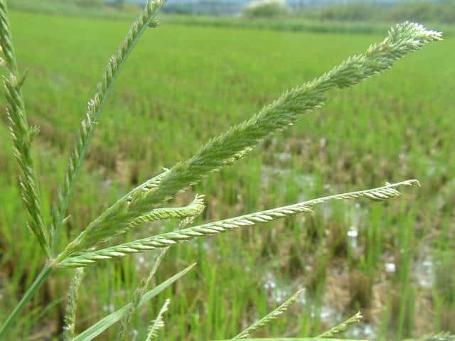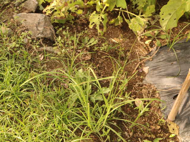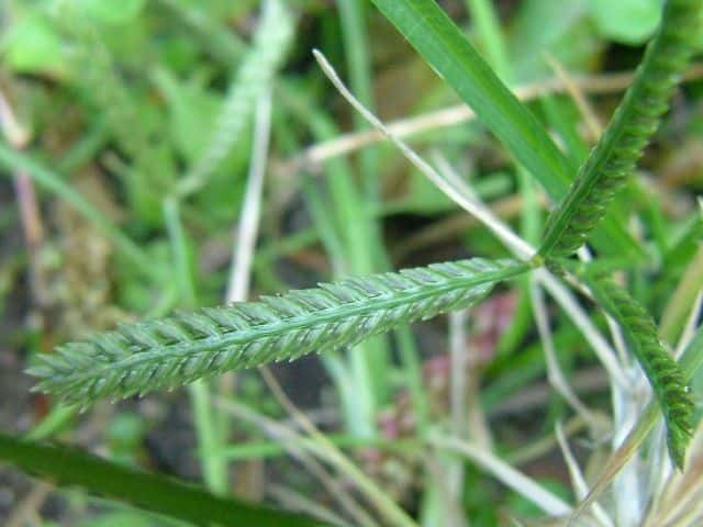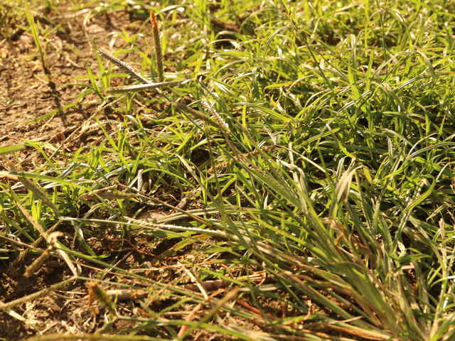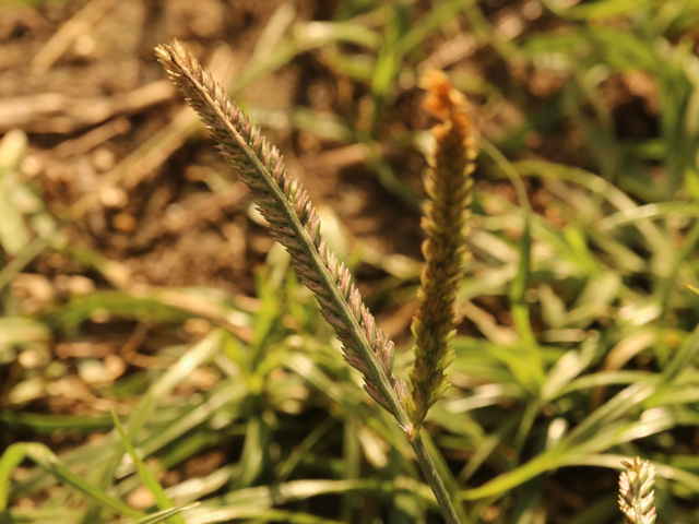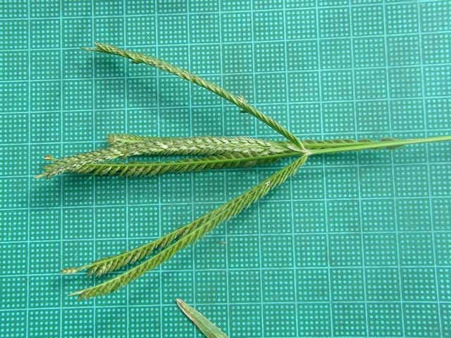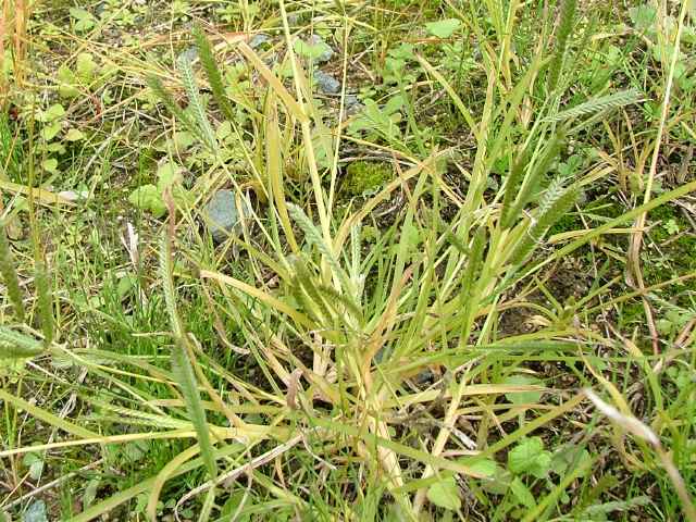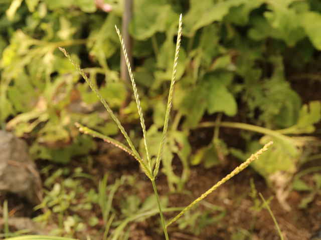 | 1年草 本州〜沖縄の畑地や日当たりのよい野原、路傍などに多く生育し、やや群生する。茎は高さは30〜80cm、分枝して叢生し扁平、平滑、斜上または直立する。葉は長さ8〜30cm、幅3〜6mm、やや堅く平滑、縁に長い軟毛を生じる。花序は掌状に数個の花軸に分かれ、各花軸の外側に2列に小穂をつける。小穂は長さ4〜6mm、4〜5小花よりなる。果実は卵状楕円形、鈍3稜があり暗褐色、長さ1.1〜1.3mm。花期は8〜9月。(日本イネ科植物図譜) 学名は、Eleusine indica イネ科オヒシバ属 |