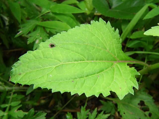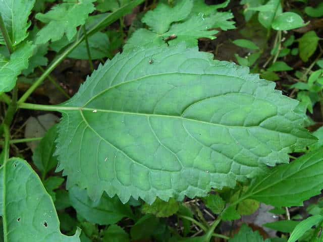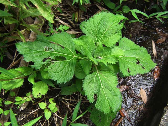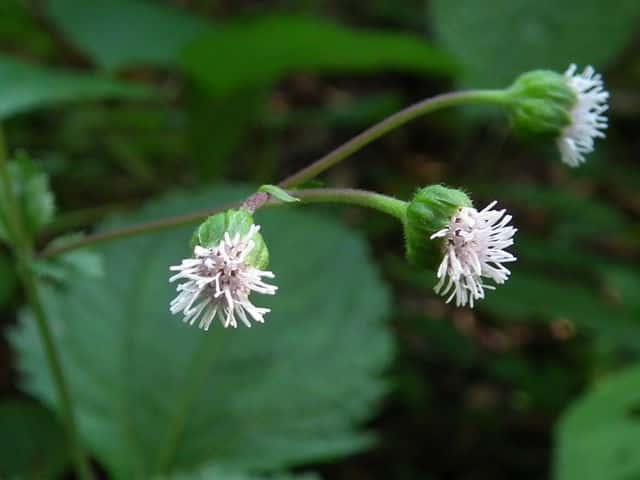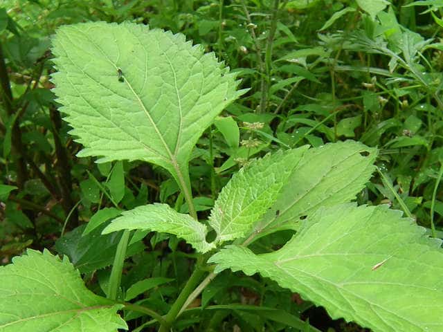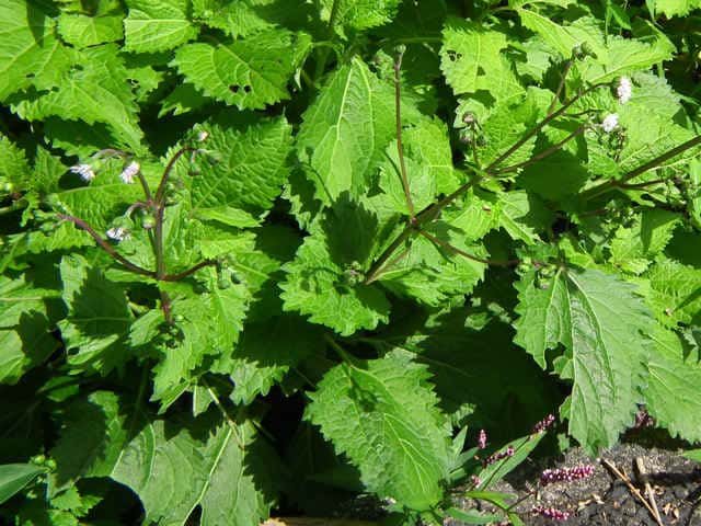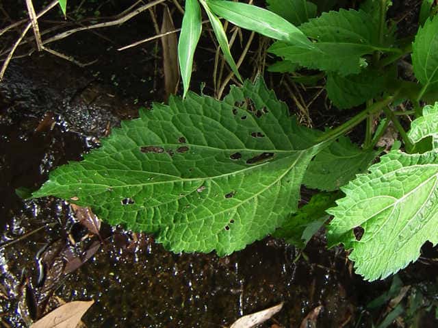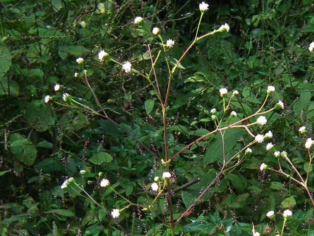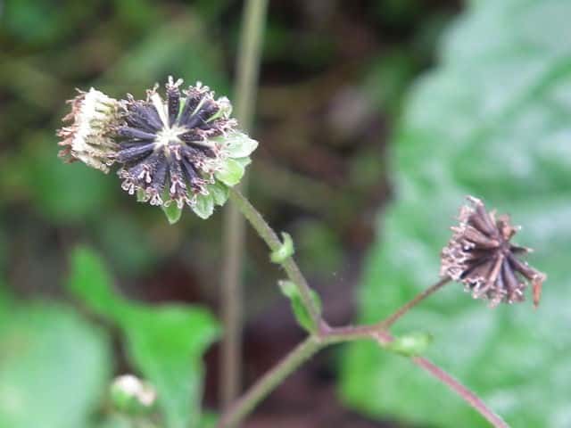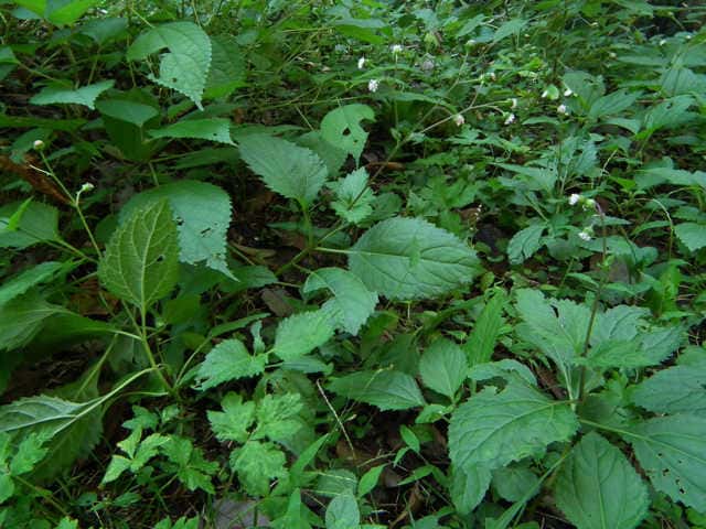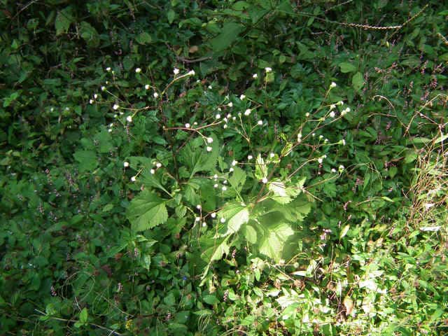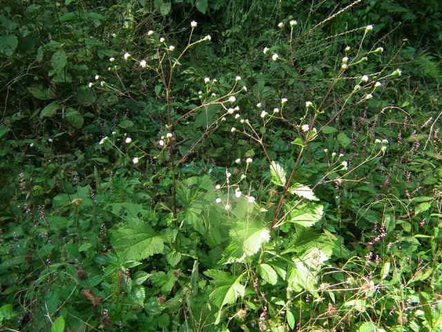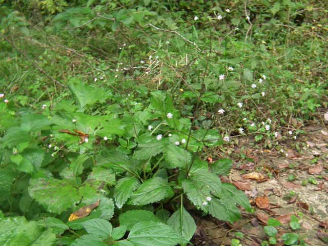 | 多年草。 本州(関東地方以西〜琉球)の湿った林縁に生える。根茎は肥厚する。茎は直立して高さ30〜150cm、基部は短くはって発根する。葉はヌマダイコンよりも多くて8〜12対、大きくて幅広く、中部のものでは長さは柄を含めて15〜40cm、幅7〜22cm、葉柄は長さ5〜10cm、葉身は卵形ないし広卵形で鋭頭、基部は円形〜切形、縁の鋸歯は多くて20〜30対、高くてとがる。頭花は長い柄の先に数個ずつ散房状について短い有毛の柄があり、総苞は球形で径9〜10mm。総苞片は基部で合生し、先は鈍く、果時には反曲する。小花は30個内外とヌマダイコンよりやや多く、花冠は少し短く約2mm。外面には毛を密生する。花柱分枝は長さ約1.5mmで花冠からいちじるしく超出する。そう果は長さ約3.5mm、黒褐色で光沢がなく、表面にまばらに膜質の微突起があるが、乾いてもかさぶた状にならない。冠毛は3または4個で長さ約0.7mm。(日本の野生植物) オカダイコン(徳島県立博物館) 学名は、Adenostemma madurense キク科ヌマダイコン属 |