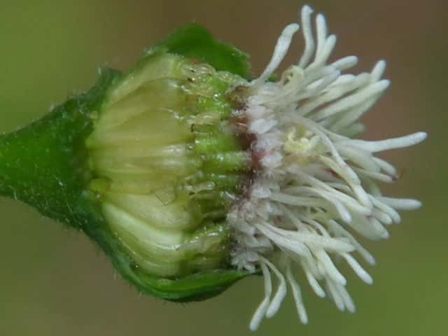 | ▼総苞を一部取り除いた。 | ▼1つの筒状花。筒部に腺毛がある。 | ▼子房の上部にこん棒状の冠毛がある。 |