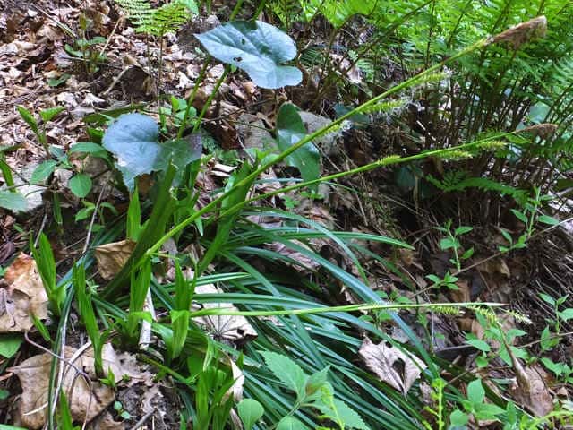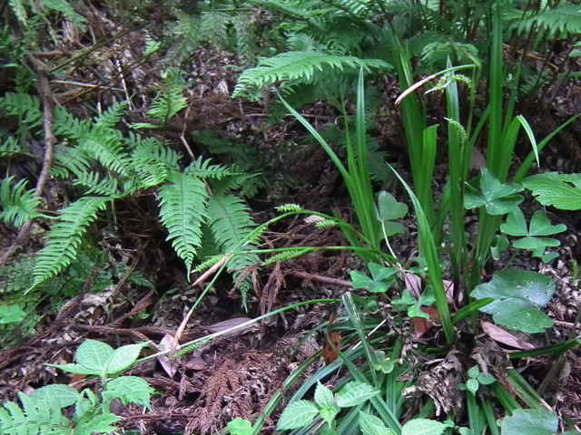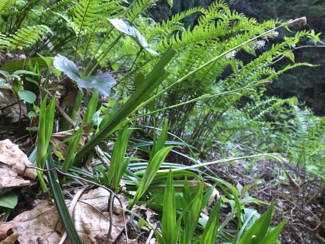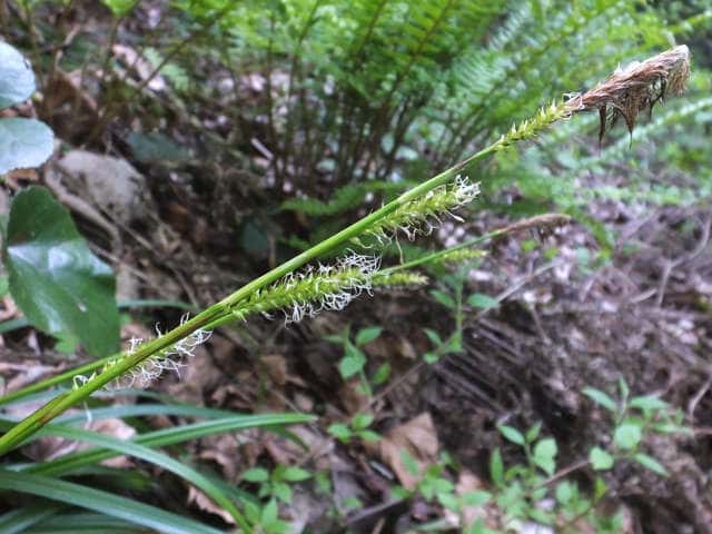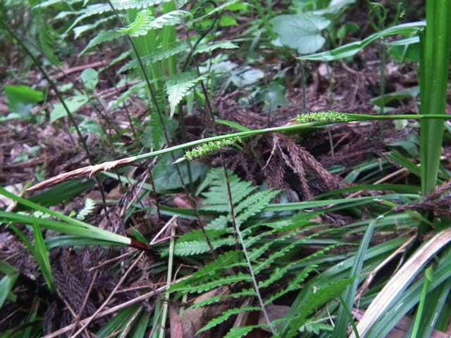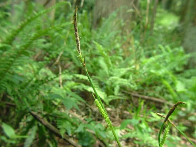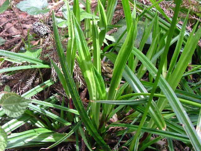 | 常緑多年草 北海道〜九州の丘陵や山地のシイ・カシ帯〜ブナ帯の樹林内に生える。根茎はやや伸長し、まばらに叢生し、匐枝を伸ばして栄養繁殖する。新葉の基部の鞘は長く伸び黒紫色で光沢があり目立つ。葉は常緑で、カンスゲほど硬くなく、幅5〜20mm、上面の2脈が強いために、葉の断面がM字状になる。有花茎は高さ15〜40cm。雄小穂はやや棍棒状で長さ1.5〜4cm。雌小穂は2〜4個、長さ2〜4cm、幅4〜5mm。雌鱗片は果胞よりも明らかに長く、先は鋭尖頭または鋭頭芒端。果胞は淡緑色、長さ2.5〜3.5mm、嘴は長く、その縁は平滑で、口部は鋭2歯。果実は長さ1.5〜2mm、頂部は直立した嘴となる。柱頭は3岐。果期は5〜6月。(日本のスゲ) 学名は、Carex foliosissima カヤツリグサ科スゲ属ヌカスゲ節 |