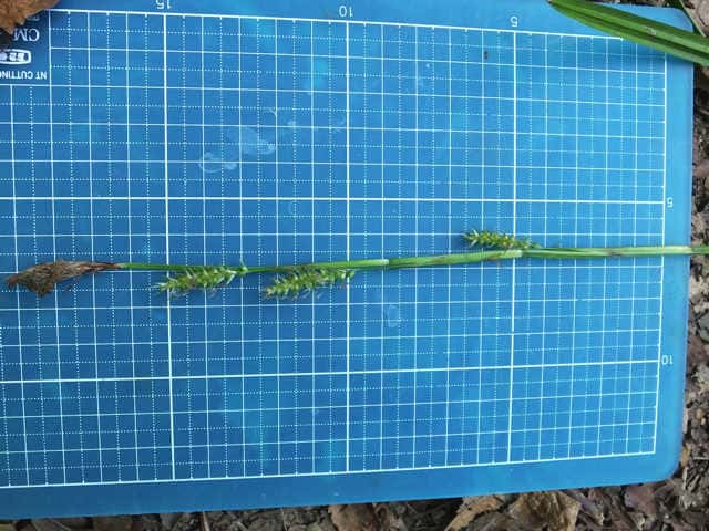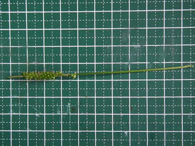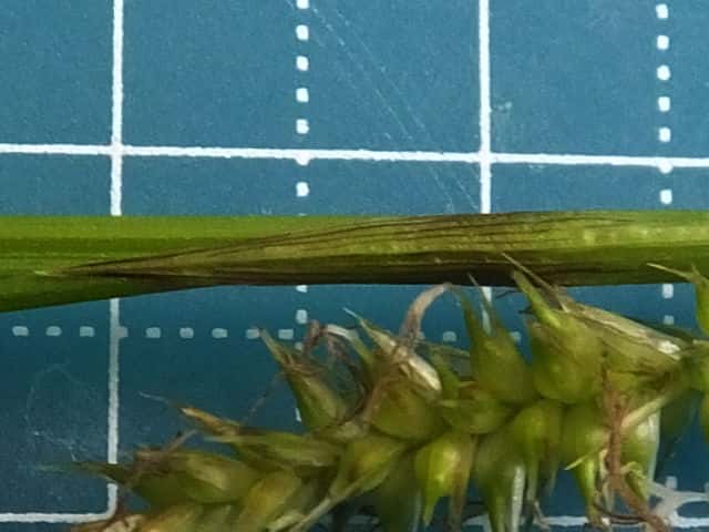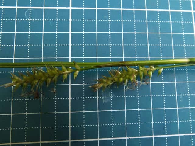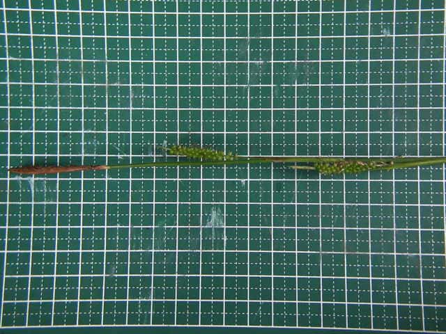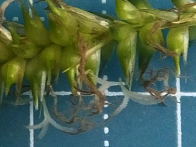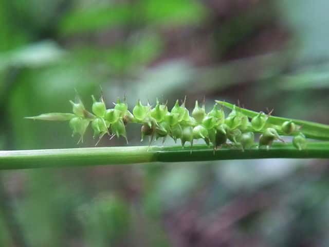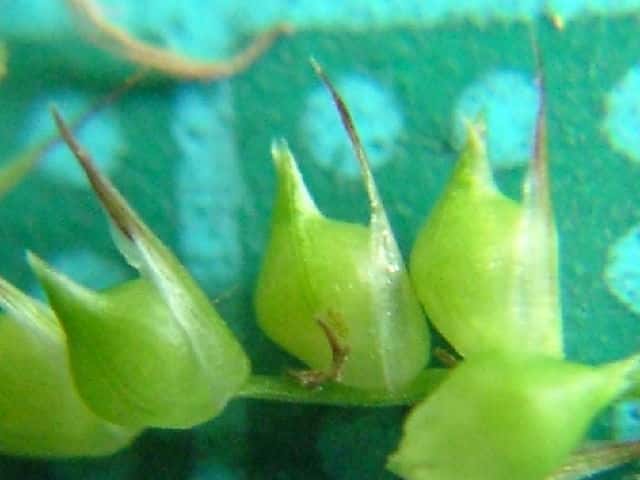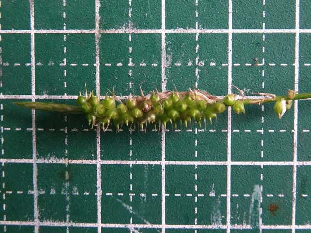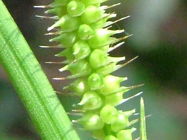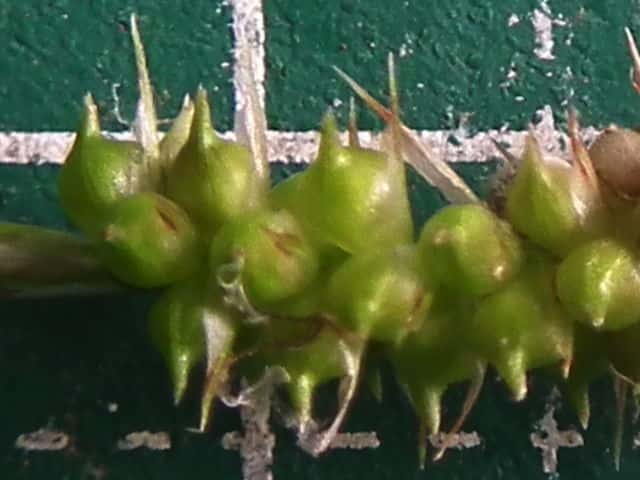 | ▼雄小穂 | ▼雌小穂は長さ約3cm。 | ▼果胞の口部は鋭2歯、燐片は長く鋭尖頭。 |
