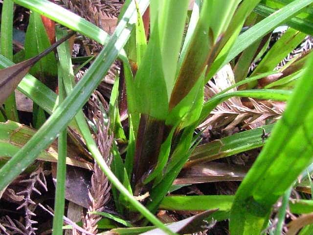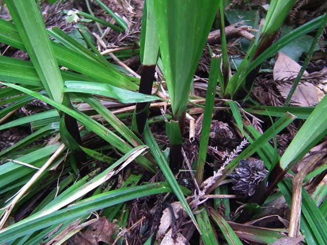 | ▼花茎は長さ約50cm。 | ▼新葉の基部の鞘は黒紫色。 | |