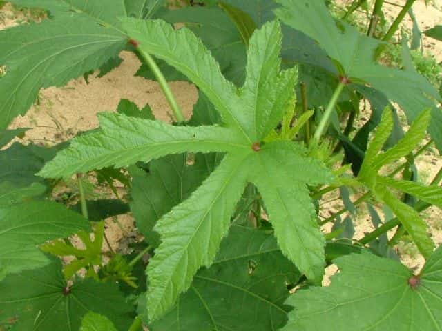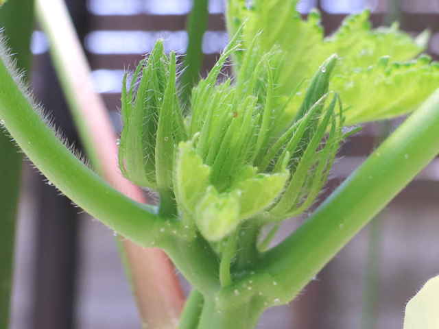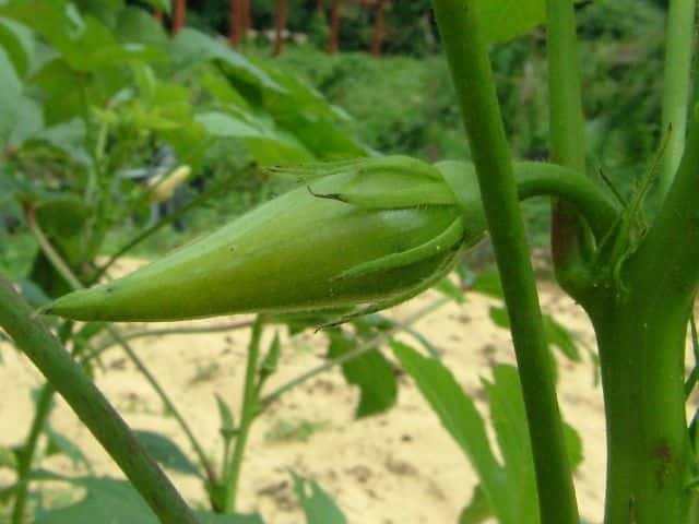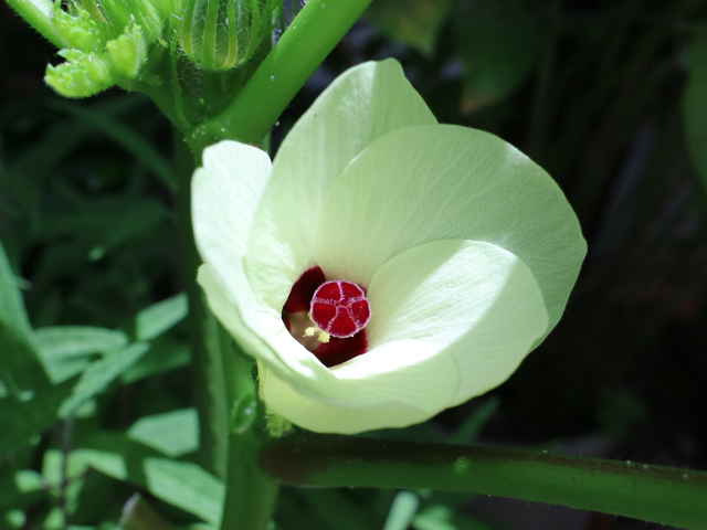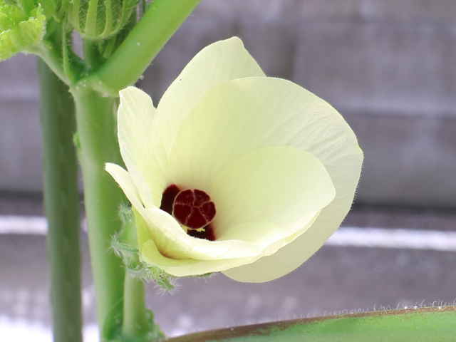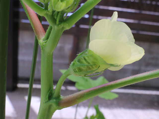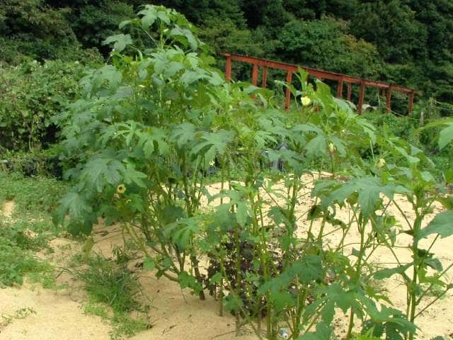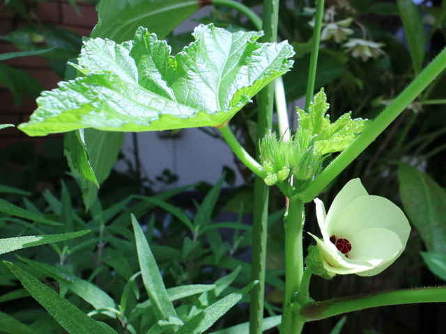 | 1年草 アフリカ北東部の原産で、日本には明治初期に入り、栽培されている。2mほどに生長し、15〜30cmの掌状の葉をつけ、黄色に中央が赤色の花をつける。開花は夜から早朝にかけてで、昼にはしぼんでしまう。5枚の萼片が合わさって1枚になり、萼片の外側には細い副萼片がつく。開花後、長さ5〜30cmの先の尖った形の五稜の果実をつけ、表面に短毛が生えており、熟すと木質化する。花期は7〜10月 学名は、Abelmoschus esculentus アオイ科トロロアオイ属 |