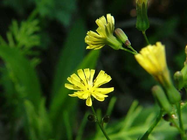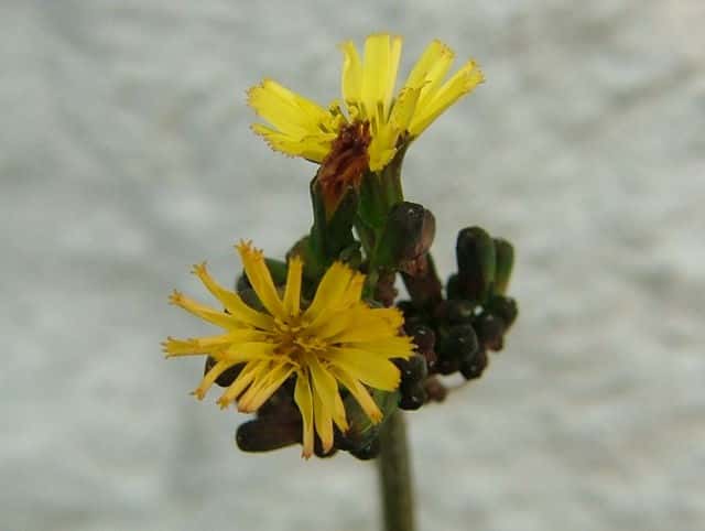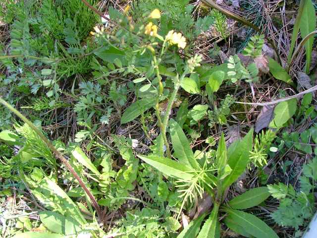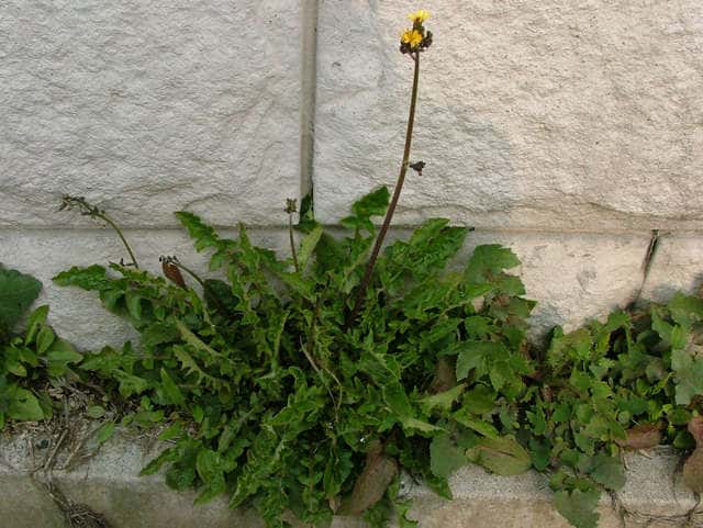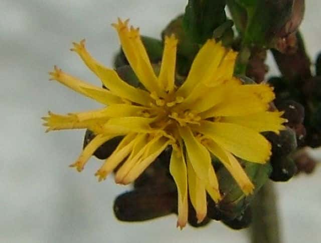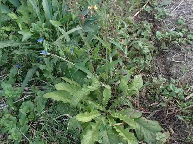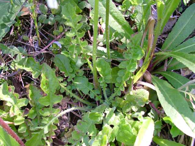 1〜越年草 日本各地の道端や畑地に生える。高さ0.2〜1mになる。全体にやわらかく、細かい毛がある。根生葉はロゼット状になる。葉は長さ8〜25cm、幅1.7〜6cmの倒披針形で頭大羽状に深裂する。頂裂片は三角状卵形で先は丸い。下部の葉は根生葉に比べ、先がとがる。茎葉は少なくて上部では小さい。直立した花茎の先に直径7〜8mmの黄色の頭花を散房状に多数つける。総苞は長さ4〜5mmの円筒形。内片は1列に並び、外片はごく小さい。花のあと総苞の基部はふくらむ。総苞片はそう果が熟すとそり返る。果実はそう果で、冠毛は白色。花期は4〜10月。 ヤブタビラコ属のコオニタビラコの果実には冠毛がないことで区別できる。 学名は、Youngia japonica キク科オニタビラコ属 最近ではオニタビラコを、 アカオニタビラコ----花茎は通常1本。 花茎は紫色を帯びる。 ロゼットは柔らかな緑色で赤い部分がある。 (これが赤鬼の名前の由来) アオに比べてやや自然度の高い環境に多く見られる。 アオオニタビラコ----花茎が通常多数出る。茎葉はつかない。 花茎は紫色を帯びない。 ロゼットは青っぽい緑色で光沢があり赤い部分がない。 (これが青鬼の由来) 路傍の植え込みなど,アカに比べて攪乱されたところに多く見られる。 に区別されることがあるようです。 |