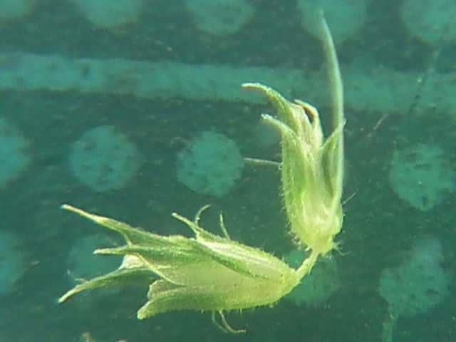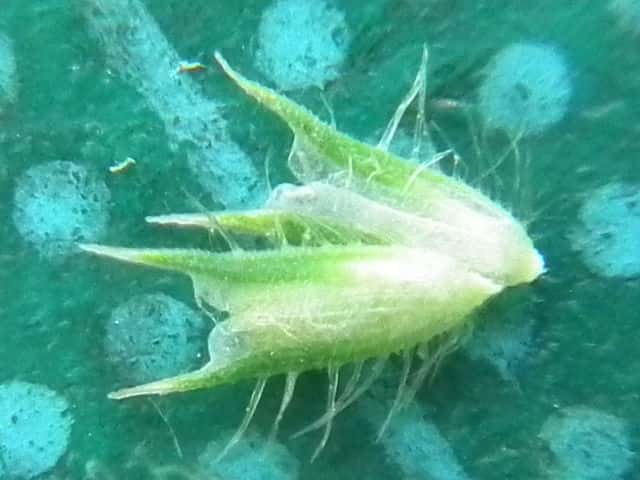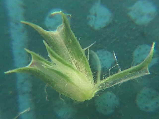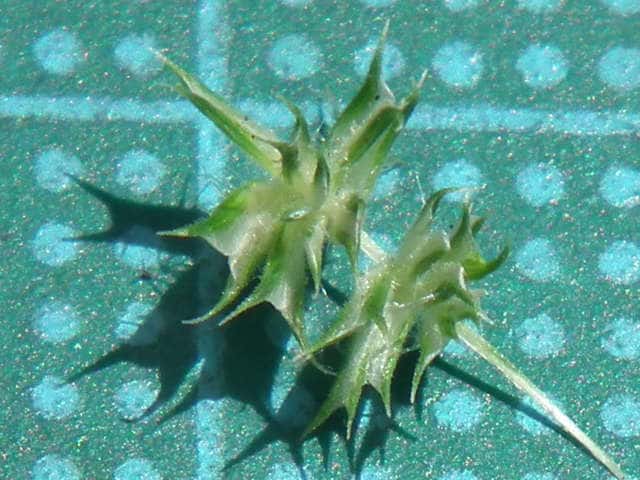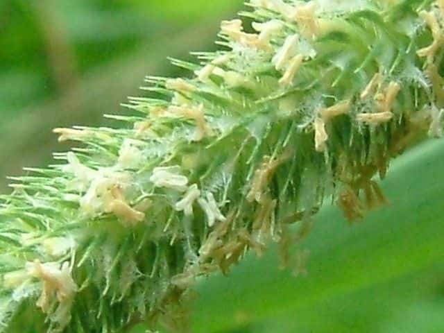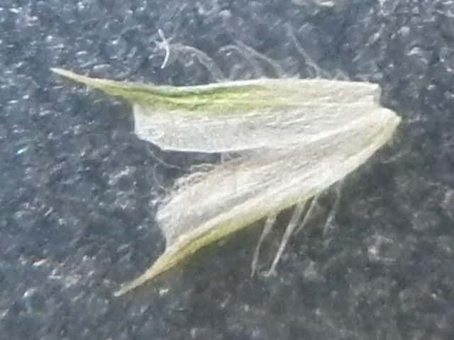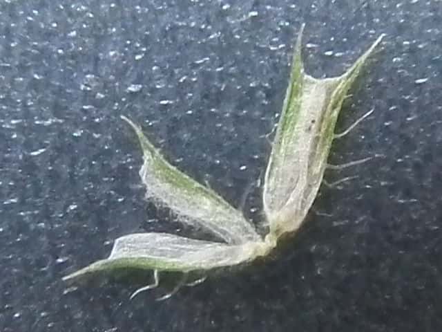 | ▼苞穎は同形同長。先端が1mmの芒になる。 | ▼1個の小穂、 苞穎の背に長毛が並ぶ。 | |