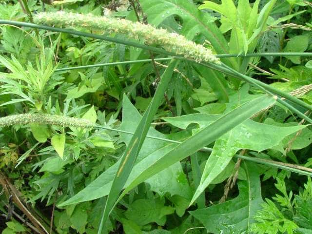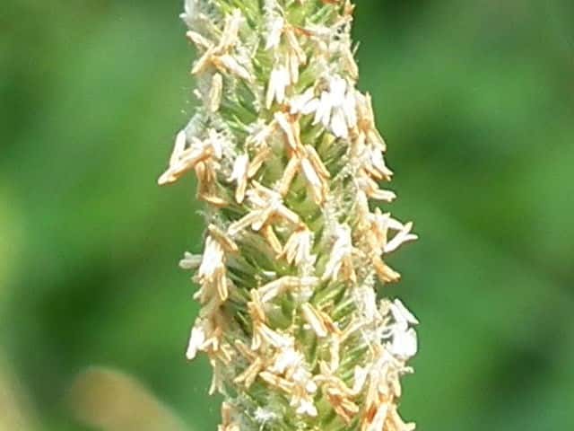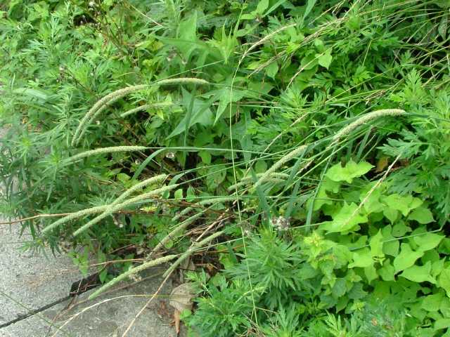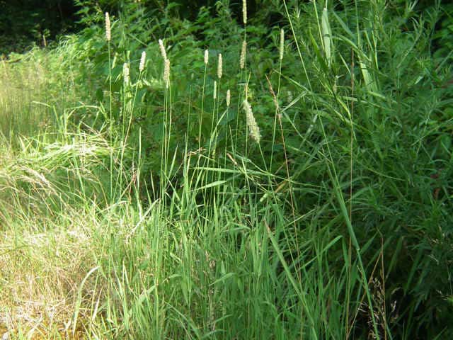 | 多年草。 ヨーロッパおよびシベリア原産の牧草であるが、北海道〜九州の路傍や休閑地などに野生化して、群生する。根茎は短く叢生し、匍匐根茎を欠く。茎は高さ80〜120cm、直立・叢生し、基部は膨大する。葉は長さ15〜25cm、幅8〜13mm、やや堅く無毛。葉舌は鋭形、長さ2.8〜5mm。花序は穂状、密に小穂をつけ、長さ8〜17cm、径7〜8mm。小穂は1小花からなり、長さ3〜3.5mm。苞穎は長楕円形、背部に長い開出毛がある。護穎と内穎は薄膜質、長さ1.5〜2mm。果実は乳白色、光沢はにぶく、長さ1.5〜1.8mm。花期は6〜7月。(日本イネ科植物図譜) 学名は、Phleum pratense イネ科アワガエリ属 |