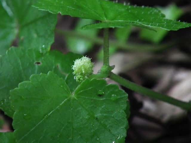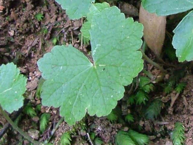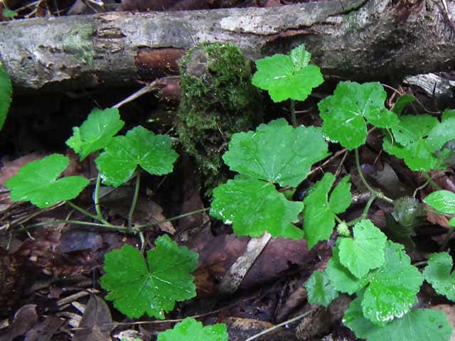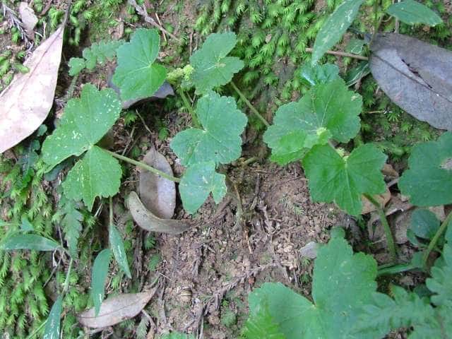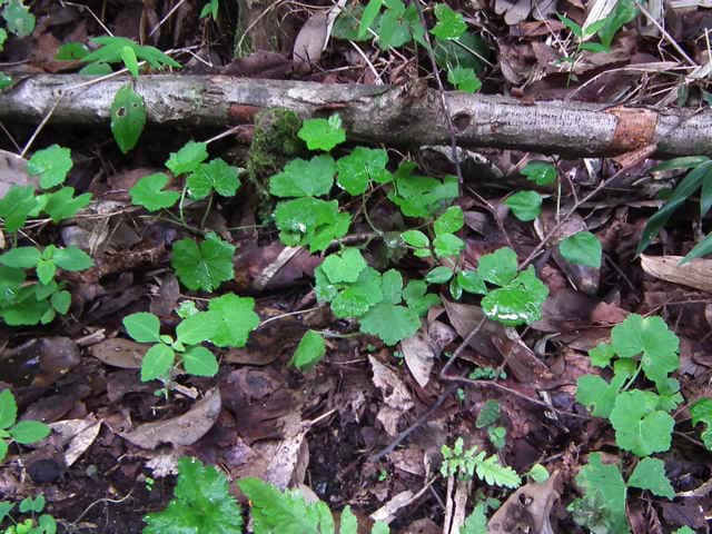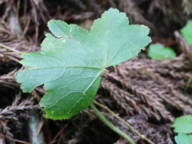 | 多年草 本州(関東以西)〜九州の山林下の湿った土地に生える。主茎は地をはい、無毛、斜上する枝に花序をつける。葉柄は無毛または反曲した短毛をまばらまたは一様につけ、主茎につく葉の葉柄は長さ6〜20cm、枝につく葉では長さ0.7〜4cmある。葉身は長さ2.5〜5cm、幅2〜6cm、脈状にまばらに短毛があり、基部は深い心形から広心形、掌状に浅く5〜6裂片に切れ込み、裂片の縁は鋸歯で鈍頭からやや鋭頭。多くは枝先の葉腋から1〜数個の花序を出し、花序柄は長さ3〜5mm、まれに主茎から葉対生で花序を出す。花は花序柄の先端に10個以上が球状に集まる。果実は平たい球形、長さ1〜1.2mm、無毛。花期は7〜10月。(山に咲く花) 学名は、Hydrocotyle javanica ウコギ科チドメグサ属 オオバチドメの仲間 |