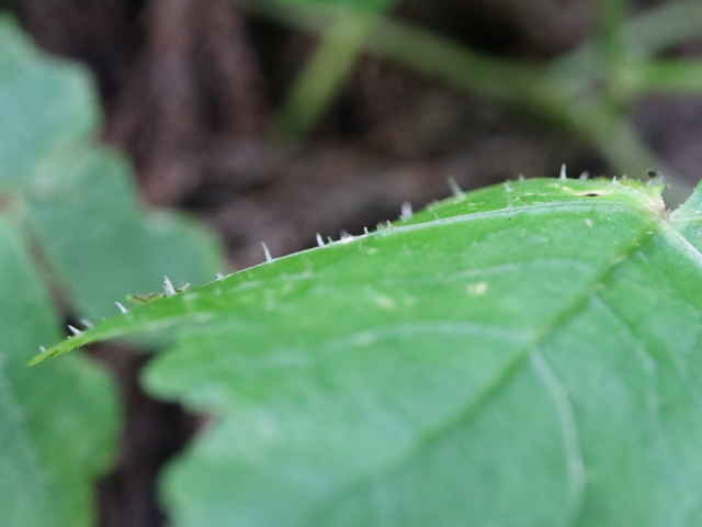 | ▼葉の表面に短毛が散生する。 | ▼葉は幅約5cm。 | |
