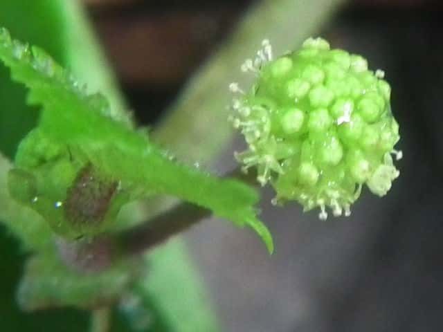 | ▼花弁の落ちた子房、長さ約1mm。 | ▼花は5弁花で、球状に集まる。 | ▼花序は直径約5mm。 |