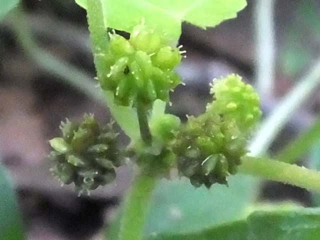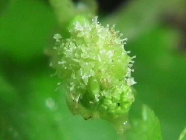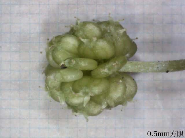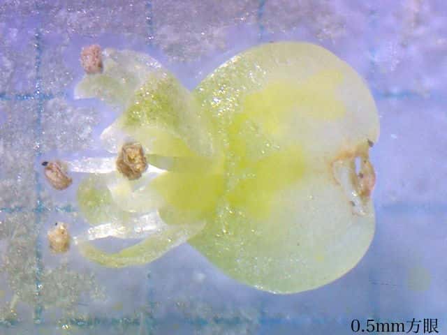 | ▼花は5弁花、雄しべ5個。 | ▼花は直径約1mm。 | ▼花弁と雄しべが落ちた雌性期の花。 |