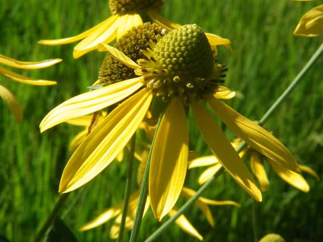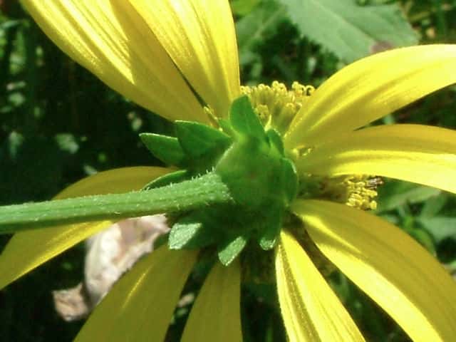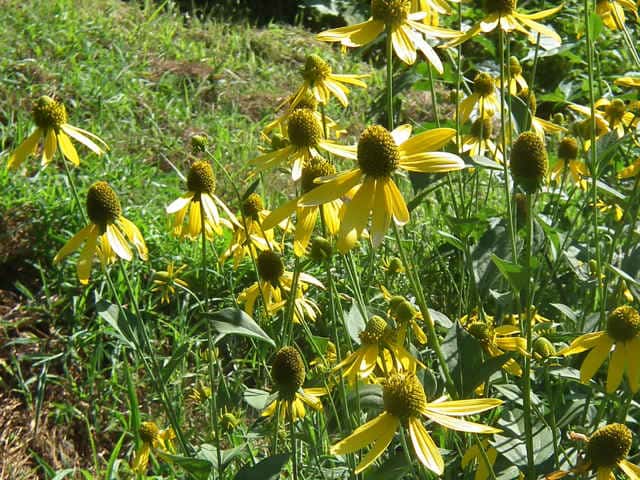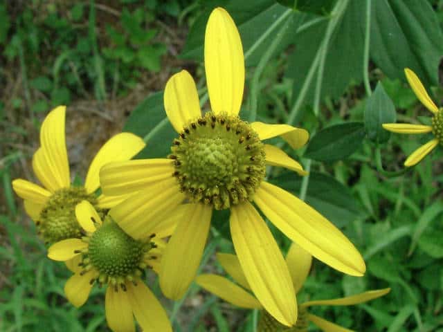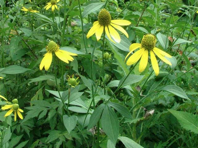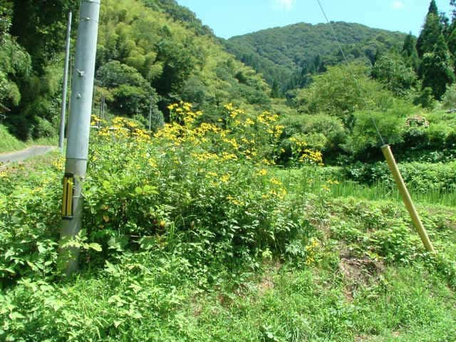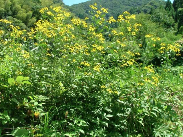 | 多年草 北アメリカ原産。明治時代中期に観賞用に導入されたが、逸出して鉄道線路沿いや河川敷などの湿った土地に大群落を形成するようになった。根株から茎をそう生し、上部で分岐して高さ3mになる。茎下部の葉は長い柄があり5〜7深裂し、裂片には粗い鋭鋸歯がある。上部の葉は短〜無柄で互生する。葉の裏にのみ短毛がある。枝の先端に直径6cmほどの黄色の頭状花をつける。舌状花は10〜14枚、筒状花は緑黄色。そう果は長さ5mmほどで、冠毛は突起状。花期は夏〜秋。(日本帰化植物写真図鑑) 学名は、Rudbekia laciniata キク科オオハンゴンソウ属 よく似たミツバオオハンゴンソウは花が直径5cmと小さく、下部の葉が3裂する。アラゲハンゴンソウは毛が多く、筒状花が暗褐色で、葉は分裂しない。 |