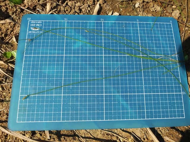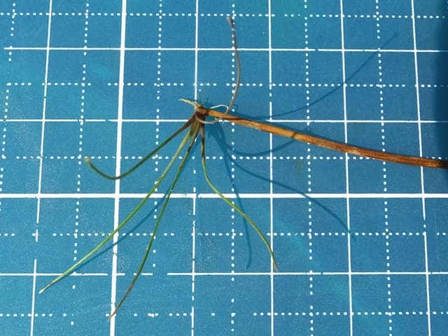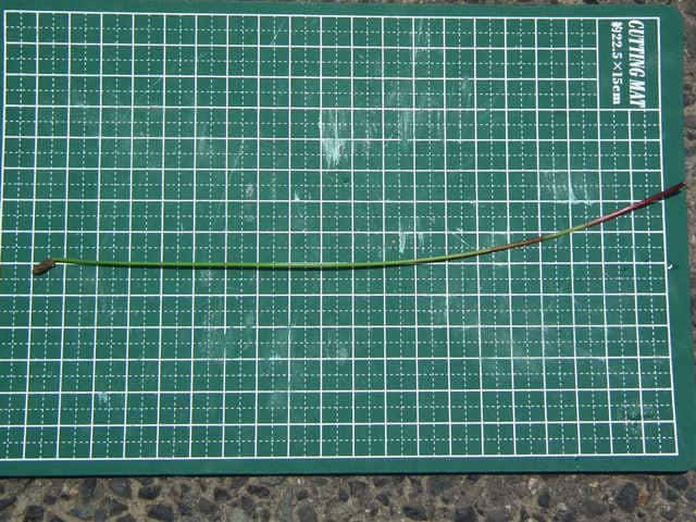 | ▼茎は長さ約30cm。 | ▼茎は径約0.9mm。 | ▼沈水状態で水面にクローン株を伸ばす。 |