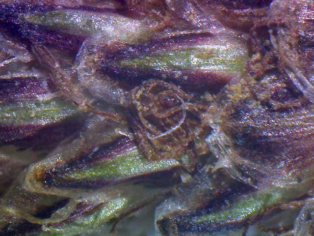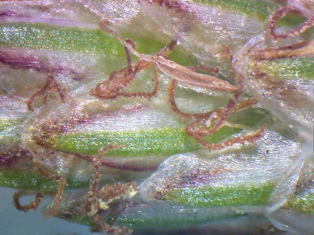 | ▼クローン株をつけた小穂、長さ約7mm。 | ▼鱗片は長さ約2mm。 | ▼柱頭は3岐。 |