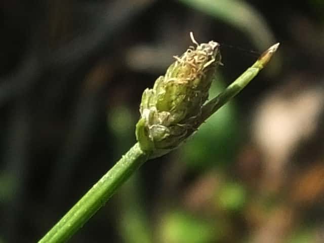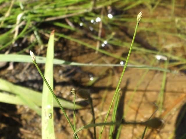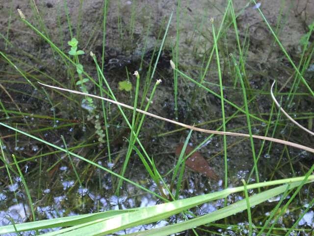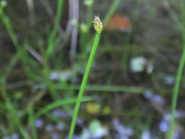 | 1年草または多年草 本州〜九州の池の周辺や湿地に生える。植物体は叢生し、匐枝はない。稈は細く直立〜斜上し、高さ20〜50cm、鮮緑色。基部の鞘は赤褐色。小穂は頂生し、狭卵形、密花、長さ5〜7mm、時に基部に腋芽ができる。鱗片は卵形、長さ2〜2.5mm、鈍頭〜円頭、一部に銹(さび)色の部分がある。そう果は倒卵形、長さ1〜1.2mm、黄緑色、横断面は鈍3稜形。刺針状花被片は6本、そう果の約2倍の長さで下向きにざらつく。柱基は3角錐形、幅はそう果の1/3、長さは幅の1.5倍である。柱頭は3個。雄しべは1〜2個。花期は6〜10月。(岡山県カヤツリグサ科植物図譜) しばしば穂の基部から無性芽が出る。水面や地面に倒伏した稈から多数の無性芽が伸びる状態が観察される。(日本の水草) 学名は、Eleocharis congesta var. congesta カヤツリグサ科ハリイ属 よく似たハリイは、茎の高さが20cm未満、茎の径0.2〜0.4mm、鱗片が長さ1〜1.5mm、そう果の長さが0.7〜0.8mmと小さい。 |