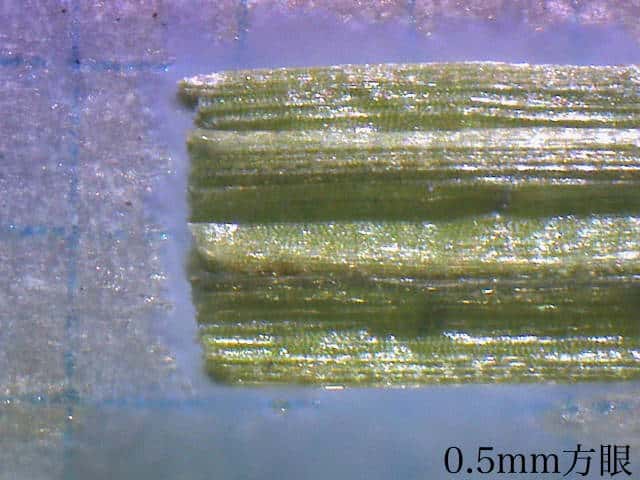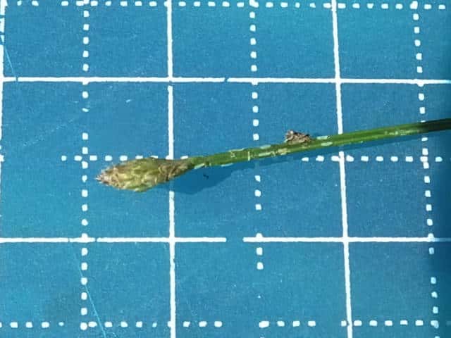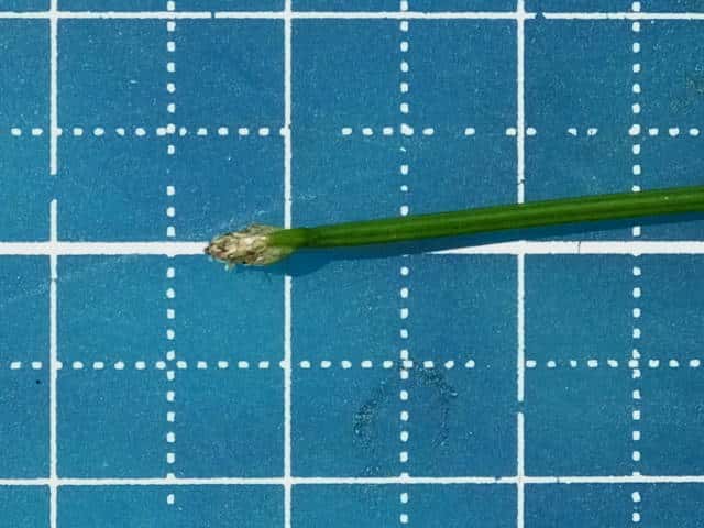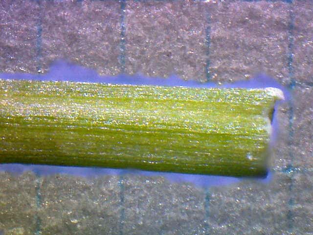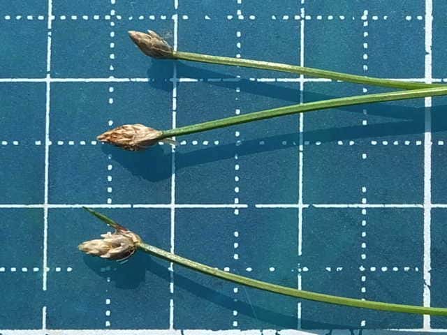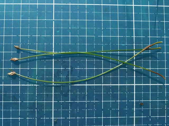 | ▼果実は長さ約1.1mm、 柱基は3角錐状。 | ▼茎は長さ約22cm。 | ▼茎は径約0.8mm。 |
