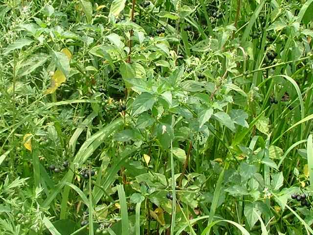 | 1年草または短命な多年草 南アメリカ原産。本州以南に古くから帰化していたと思われ、市街地だけでなく、河川敷、畑地、林縁などに普通に見られる。茎は直立するが、越冬した大きな株では基部が倒伏し、長さ2〜3mに達する。葉は卵形で全縁または波状の鋸歯があり、下面全体に細毛を密生する。花序は5〜8花をつけ、花数が多くなると基部の小花柄1〜2個は離れてつき、花序はやや総状となる。花冠は白色ときに紫色を帯び、直径8〜12mm、5深裂し、裂片は基部近くまで切れ込み、幅が狭い。果実はほぼ球形で、直径7〜10mm、やや光沢があり、果皮は黒く熟すが、完熟するまでは果肉は緑色で、60〜120種子を入れ、4〜10個の白色球状の顆粒を含む。種子は淡黄褐色で小さく、長さ1〜1.3mm。花冠が大きく、花序がやや総状になるために在来のイヌホオズキと混同されるが、イヌホオズキは花冠がやや浅く切れ込み、裂片の幅が広いこと、果実にまったく光沢がないこと、種子が長さ約2mmあること、果肉中に白色球状の顆粒を含まないことで区別できる。花期は8〜12月。(日本帰化植物写真図鑑) 学名は、Solanum nigrescens ナス科ナス属 種子の大きさと1果中に入っている数 オオイヌホオズキ :1.0−1.3mm、60〜120個、球状顆粒4〜10個 イヌホオズキ :2mm 、30〜60個 、球状顆粒 なし アメリカイヌホオズキ :1.0〜1.3mm、60〜120個、球状顆粒4〜10個 テリミノイヌホオズキ :1.5〜1.8mm、 、球状顆粒1〜4個 カンザシイヌホオズキ :1.5〜1.8mm、 、球状顆粒 なし イヌホオズキの仲間 |