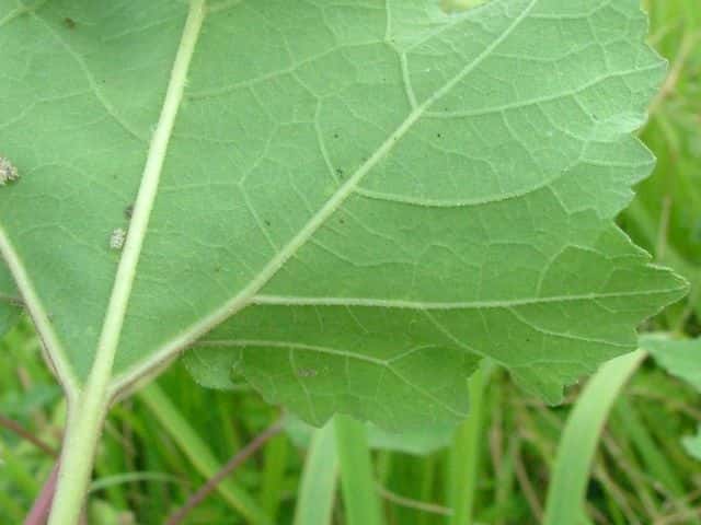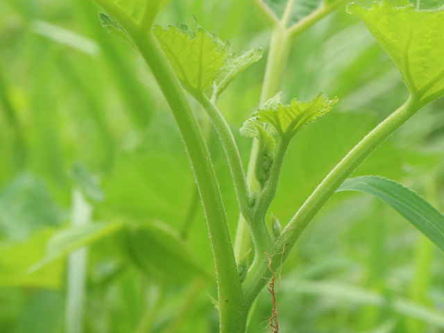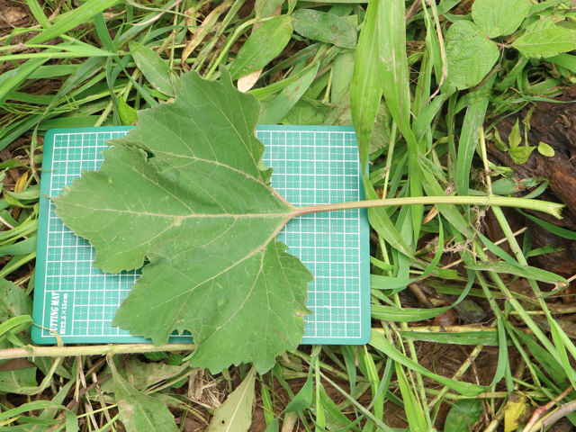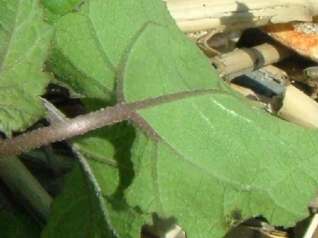| ▼葉身は長さ約13cm。 | ▼茎や葉柄に上向きの短毛がある。 | ▼高さ約80cm。 |