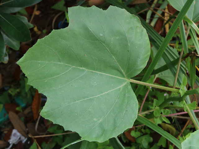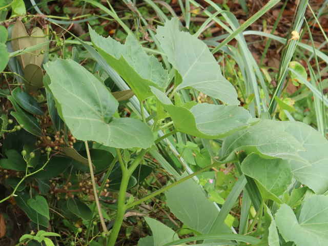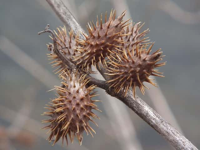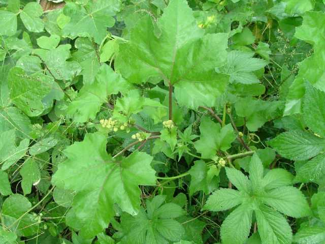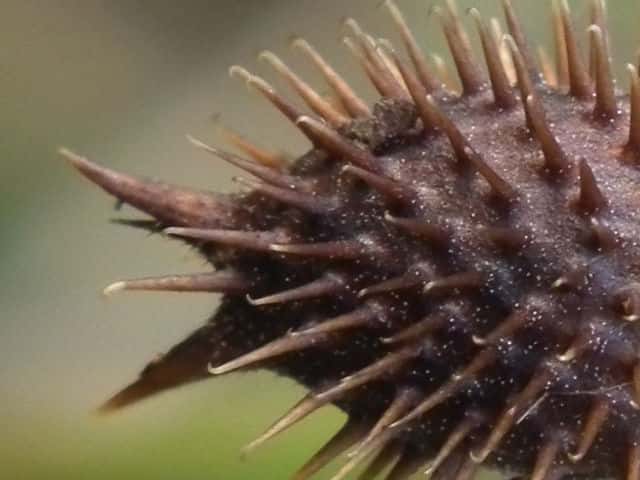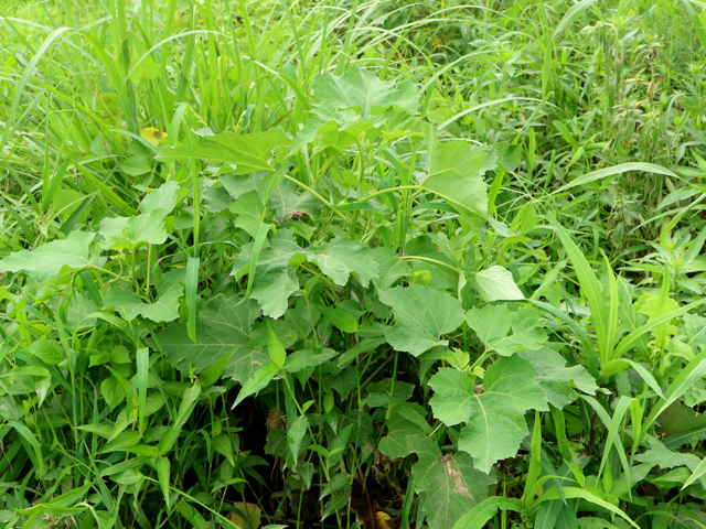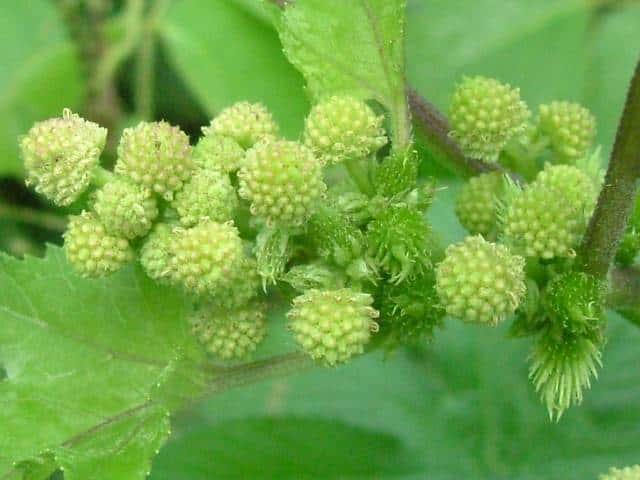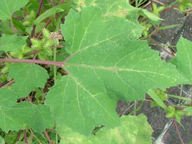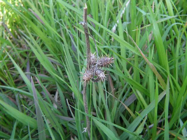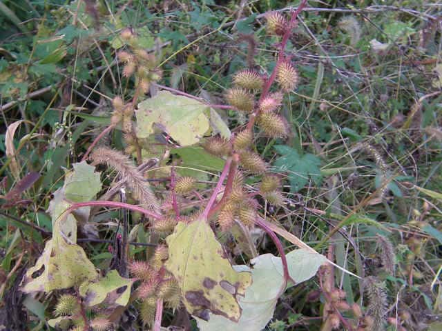 | 1年草 北アメリカ原産。1929年に岡山県ではじめて見つかり、現在では各地に広く帰化している。茎は褐紫色を帯びるものが多く、高さ0.5〜2mになる。葉は長い柄があって互生し、卵形または広卵形で3〜5浅〜中裂する。ふちには不ぞろいの鋸歯があり、両面ともざらつく。雌雄同株。雄頭花は葉腋からでた短い花序につく。花糸は合着して筒をつくり、葯は離生している。雌頭花は雄花序の基部に集まってつく。総苞片が合着して壺形になり、なかに花冠がなく雌しべだけになった雌花が2個入っている。花柱は総苞の外につきでる。総苞は成熟すると肥厚してかたくなる。果苞は1.8〜2.5cmの楕円形で、先端にくちばし状の突起が2個あり、表面には長さ3〜6mmのカギ状の刺が密生する。熟すと褐色になる。花期は8〜10月。(野に咲く花) 学名は、Xanthium occidentale キク科オナモミ属 よく似たイガオナモミは果苞が17〜30mmと大きく、刺がより密生し鱗片毛や腺毛が多い。 |