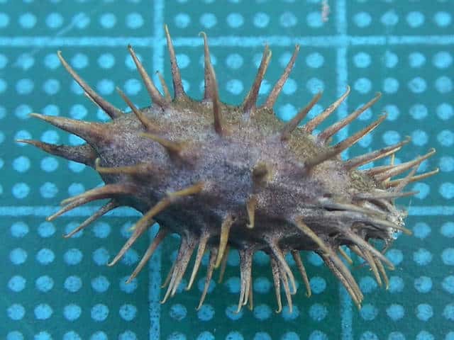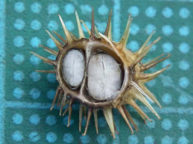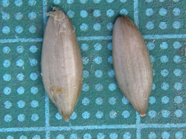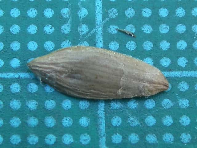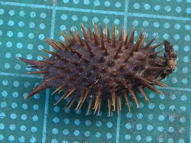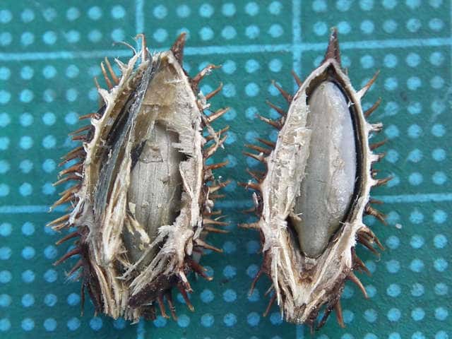 | ▼果苞は嘴を含めて長さ約2cm。 | ▼果苞の縦断面、2室ある。 | ▼仕切りを挟んで2個の果実がある。 |