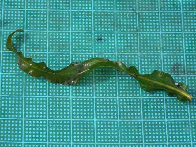 | ▼花穂は長さ約3cm。 | ▼葉はねじれて、縁は波打つ。 | |