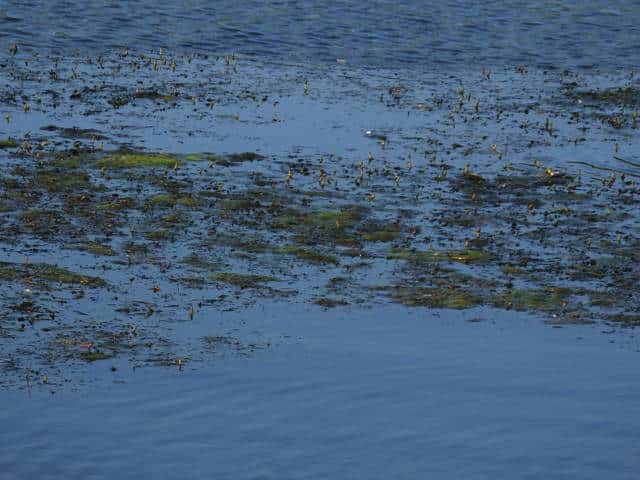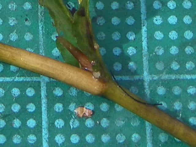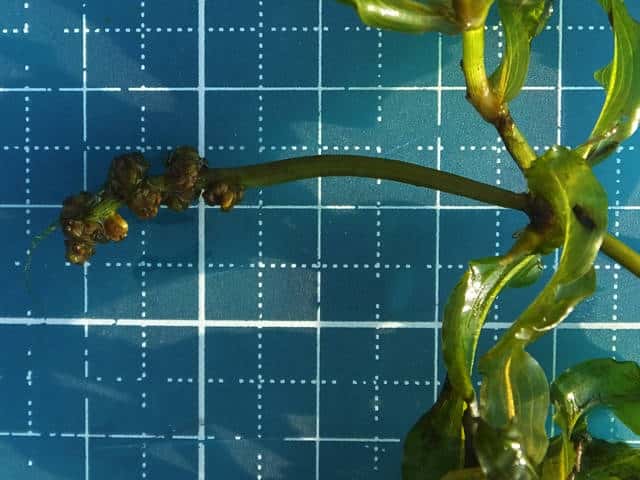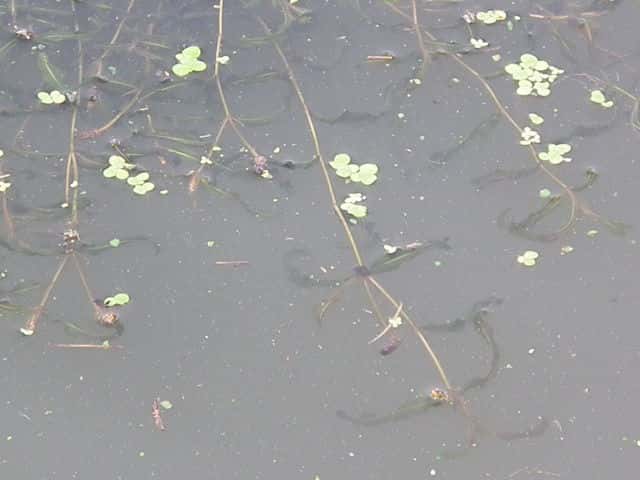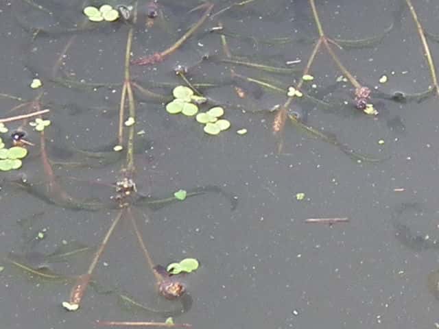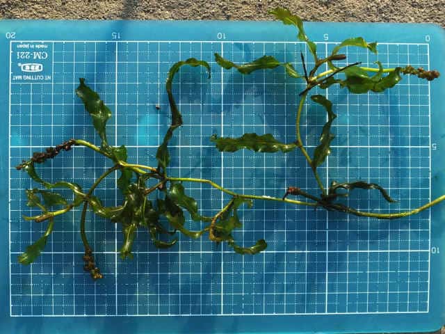 | 多年草 関東以西の本州〜九州の湖沼や河川などに生育する沈水植物。水中茎は長さ1mを超えることもある。葉は無柄、葉身基部は茎を半周ほど抱くのが普通。葉身は狭披針形〜狭長楕円形で長さ6〜16cm、幅6〜12mm、多かれ少なかれねじれる。先端はやや鋭頭または鈍頭で、ササバモのように突出することはない。葉縁は細かく波打つ。花茎は長さ4〜11cm、花穂は長さ2〜3cmで密花、4心皮。結実は極めて稀。花期は7〜9月。(日本の水草) 学名は、Potamogeton anguillanus ヒルムシロ科ヒルムシロ属 |