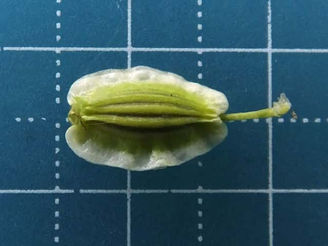 | ▼果実は長さ約1cm、2個が合わさっている。 | ▼2個を分けたもの、合生面。 | ▼果実の背面、3個の隆起線がある。 |