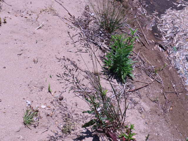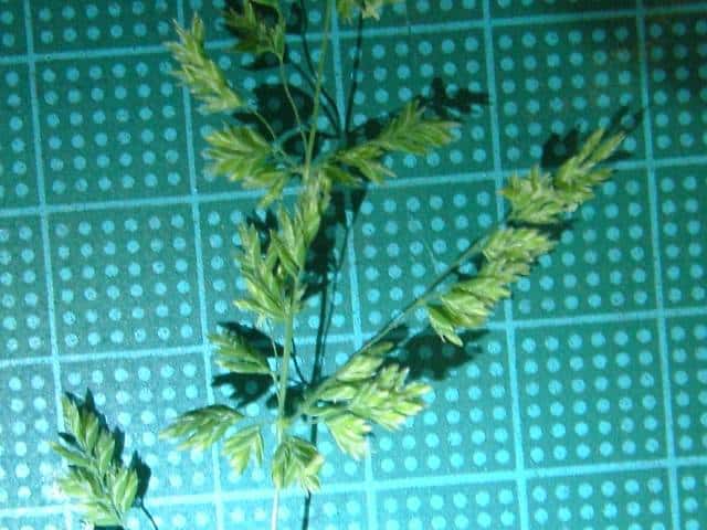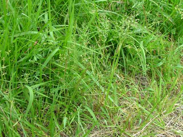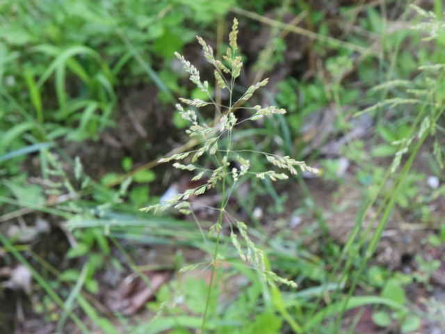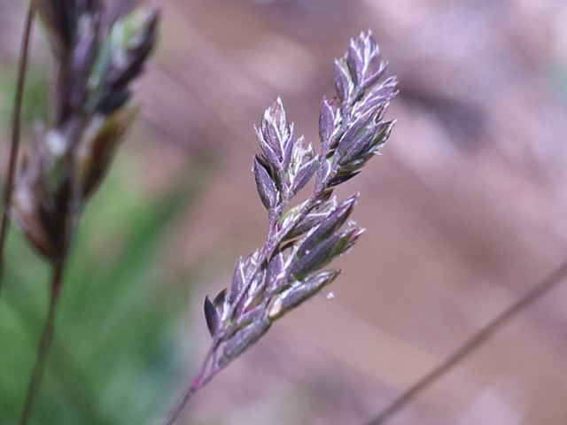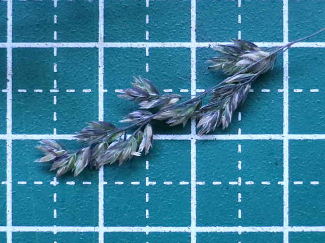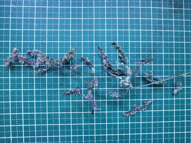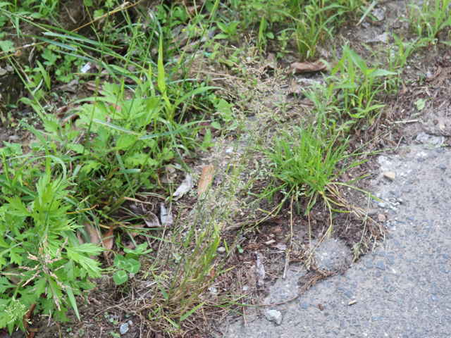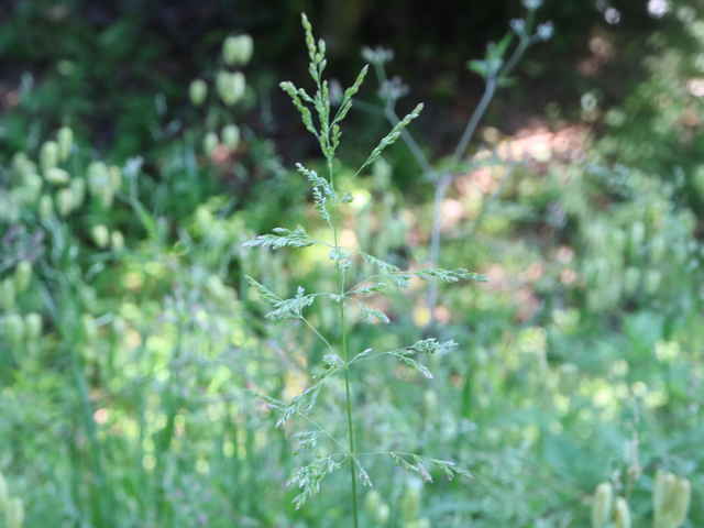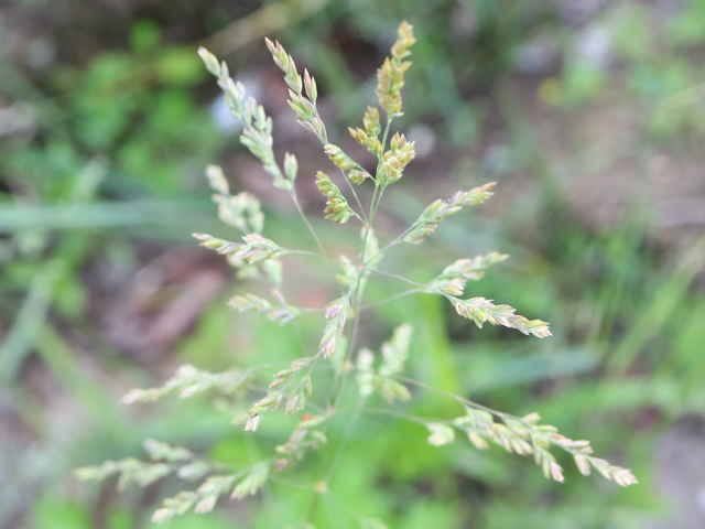 | 多年草 ヨーロッパから西アジアにかけての原産。全国に帰化しており、北海道などでは畑地の雑草になっている。細い根茎を引いてまばらに群生する。稈は細く、基部で伏してその上部で直立して高さ1mになる。葉は線形で無毛、葉舌は高さ6mmほどある。4個ほどの小花からなる長さ4mmほどの小穂を、細かく分岐した穂に多数つける。穂の枝の基部には小穂がつかない。花期は夏。(日本帰化植物写真図鑑) 耕地の周辺やたのあぜ、農道などに生育し、粗生または群生する。茎は一方に傾き、平滑で光沢があり、基部は伏臥し、細長い根茎に連なる。葉は無毛、葉舌は鋭形、白い半透明の膜質、長さ3〜4mm。葉鞘は平滑・無毛。花序は長さ20〜30cm、各節から2〜5個の枝を半輪生状に出し、一方に傾く。枝は細く糸状、長さ3〜10cm、上向きの短剛毛を生じ、小穂をまばらに着ける。小穂は長さ2.8から3mm、2〜3小花よりなる。第1苞穎は長さ2〜2.5mm、1〜3脈。第2苞穎は2.5〜3mm、3脈。護穎は5脈、先端は銅色に輝き、基部の竜骨と側脈に白色の毛をまばらに生じる。基部の縮れ毛は長い。花期は7〜8月。(日本イネ科植物図譜) 学名は、Poa trivialis イネ科イチゴツナギ属 よく似たものにイチゴツナギがあるが、花序の枝は斜上し開出しない。 ナガハグサは、葉舌が短い。 |