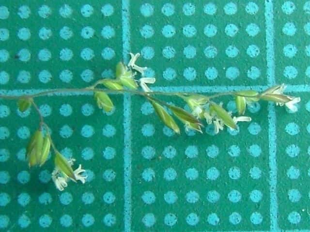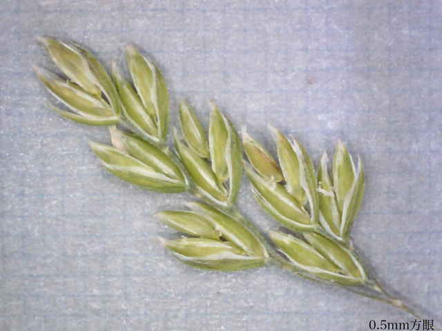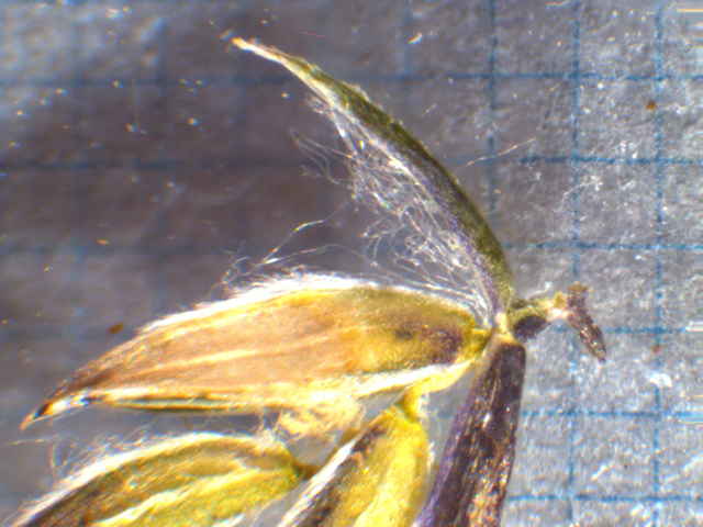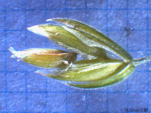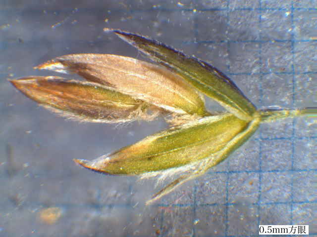 | ▼小穂は長さ約3mm。 | ▼小花の基部に縮れた毛と、竜骨に毛がある。 | |