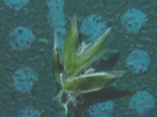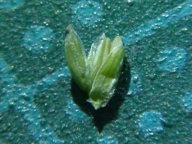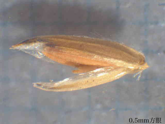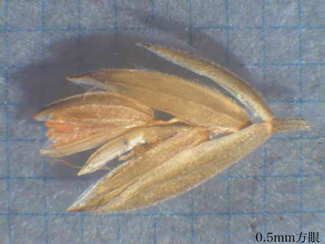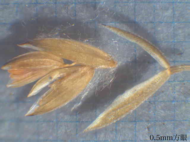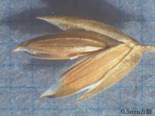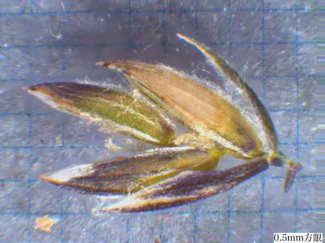 | ▼護穎の先端が内側を向く。 | ▼第1苞穎は長さ約2mm、第2苞穎は約2.5mm。 | ▼護穎の基部には長い縮れ毛がある。 |