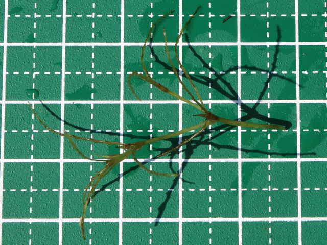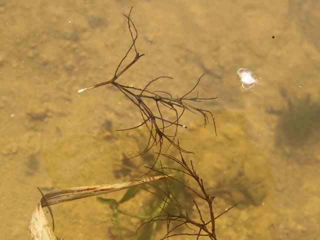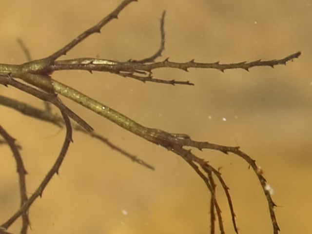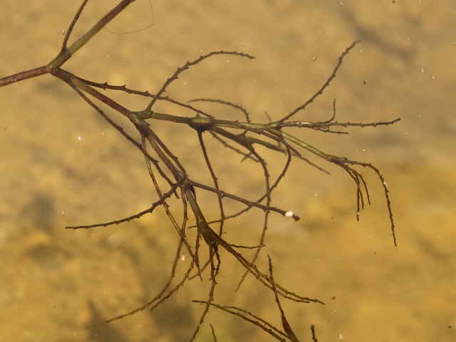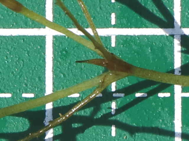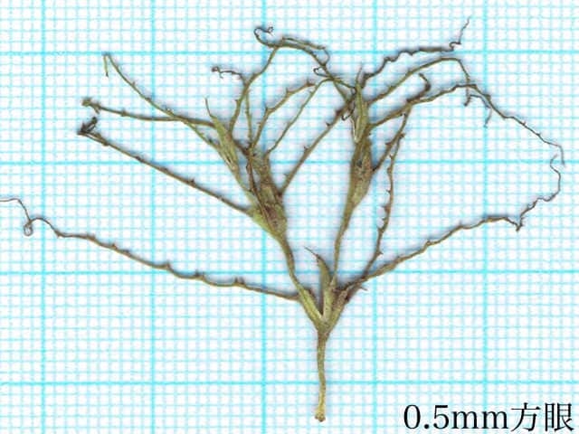 | 1年草 本州〜沖縄の湖沼やため池、稀に水路などにも生育する沈水植物。茎は細く円柱形、ほぼすべての節で二叉状に分枝を繰り返しながら成長し、長さ50cmを超えることもある。葉は対生するが分枝する節では3輪生状となる。基部は長さ2〜4mmの葉鞘となり、先は切形で縁には小刺がある。葉身は線形、長さ(1〜)2〜4cm、幅0.3〜0.7mm、多数の鋸歯がある。雌雄同株。雄花は苞に包まれ、葯は長さ1.5mm、4室。雌花は苞に包まれず柱頭は2深裂する。種子は長楕円形、長さ3〜3.5mm、横に長い梯状網目模様がある。花期は7〜10月。(日本の水草) 学名は、Najas oguraensis トチカガミ科イバラモ属 |