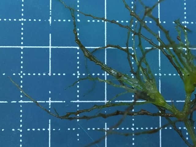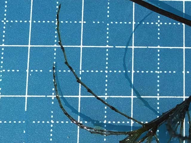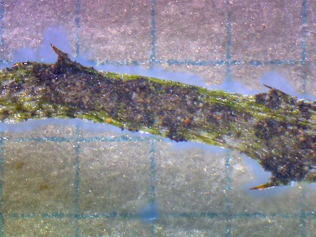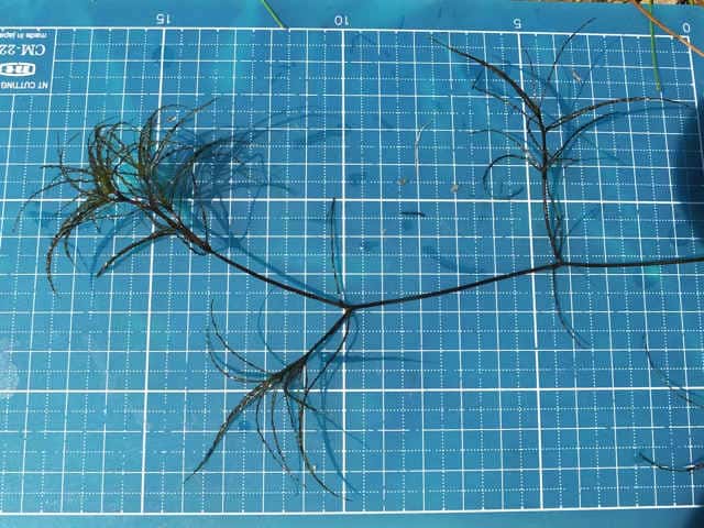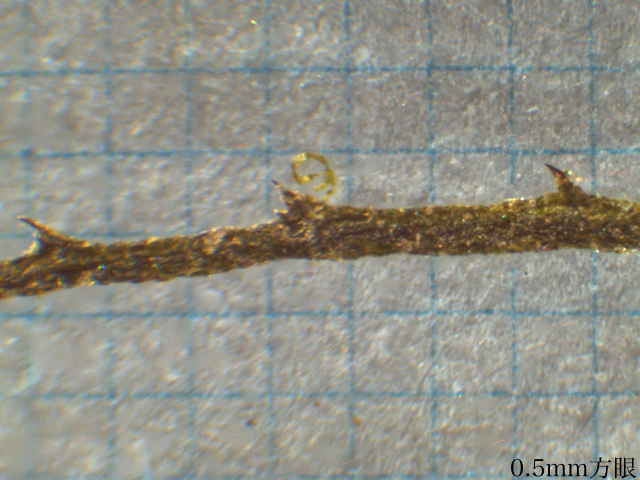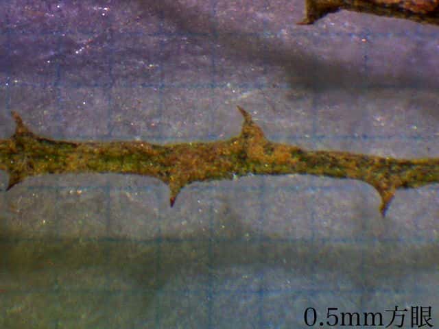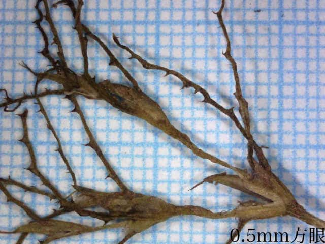 | ▼2015年9月14日 宍道 | ▼葉は長さ約3cm。尖った鋸歯がある。 | ▼葉(乾燥標本) の幅は0.2〜0.3mm。 |